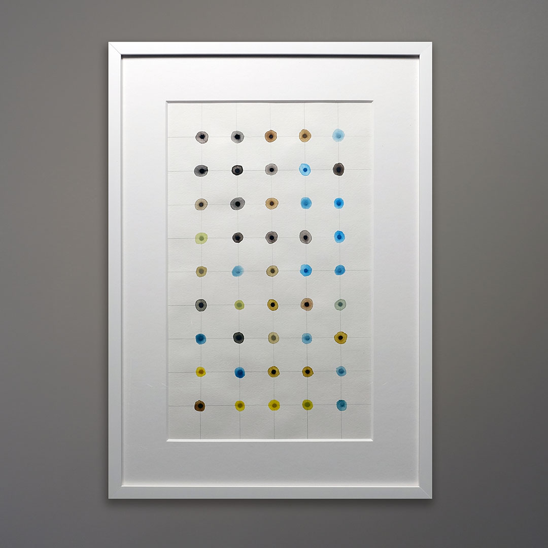 Original watercolor painting on paper by Shelter Island artist Leah Peeks, 2021. Titled “Dusk.” Peeks drew inspiration from the Washington D.C. Color School painters of the 1950s, especially Sam Gilliam, while she was living in Virginia. This artwork is distinctive because of the way the pattern responds to the viewer’s eye. A sense of movement, an awareness of the near-perfect but also not-perfect design. 19×27 as framed in matte white with an 8-ply mat and gallery acrylic glazing.