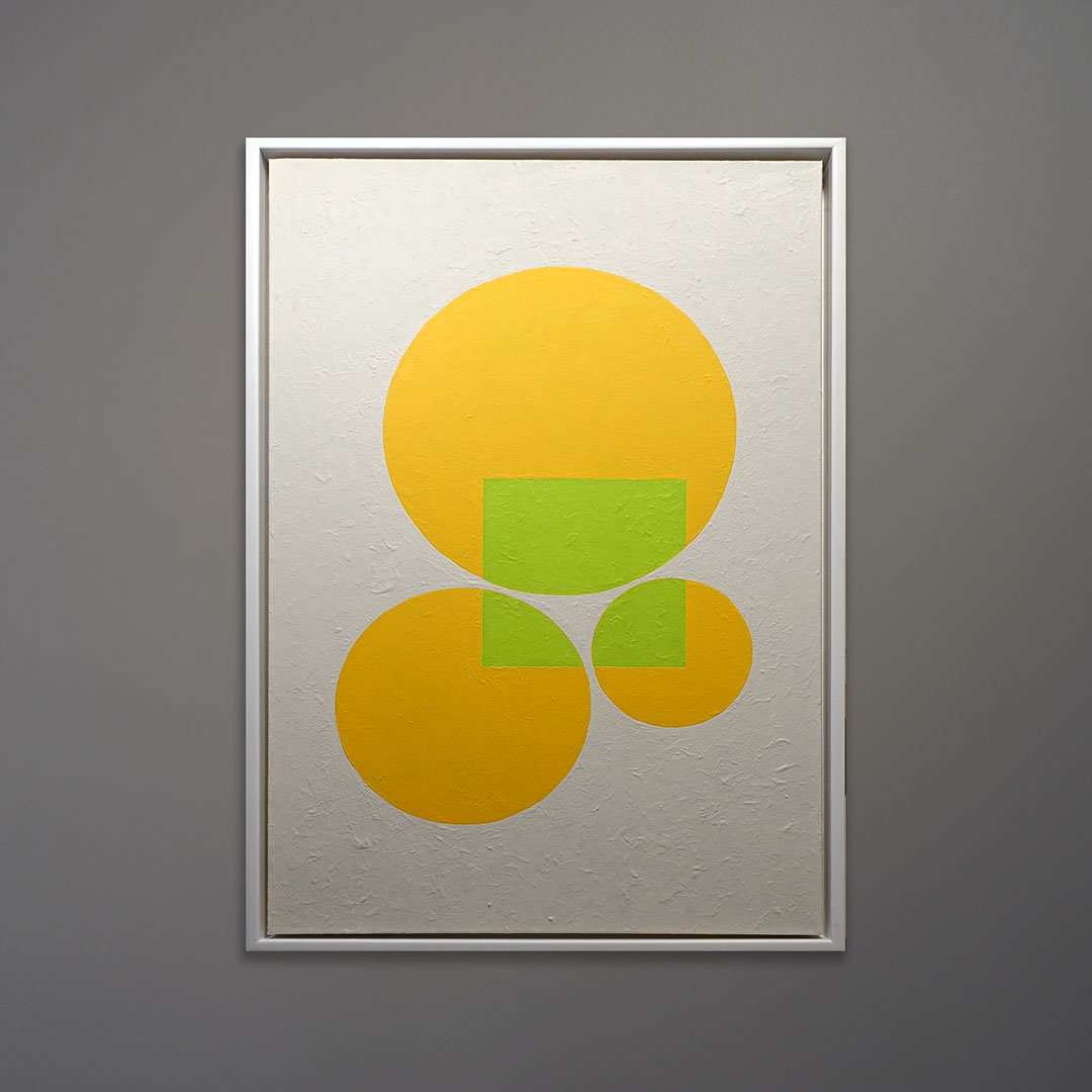 “Square Circles III” by Michael Aron, 2022. 26 × 38 inches. An original synthetic polymer abstract painting on canvas in a matte white floater frame. Hangs either vertically or horizontally. Inspired by the Hard Edge paintings of Leon Polk Smith and Kenneth Noland.
