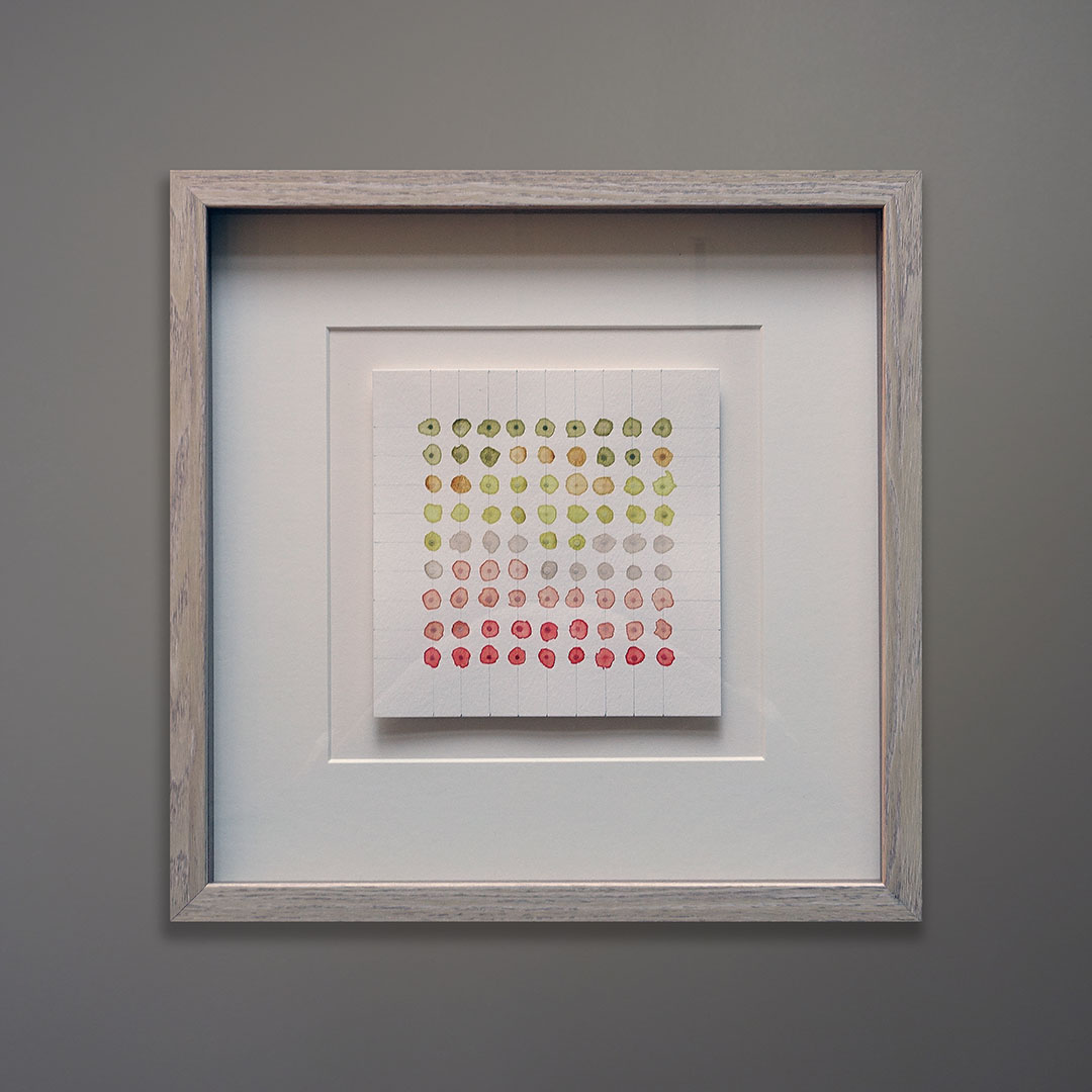 Original watercolor by Shelter Island artist Leah Peeks. This piece is 6 × 6 inches float framed in 12 × 12 oak tone wood. It is titled “Seasonal Sketches” signed and dated 2022.