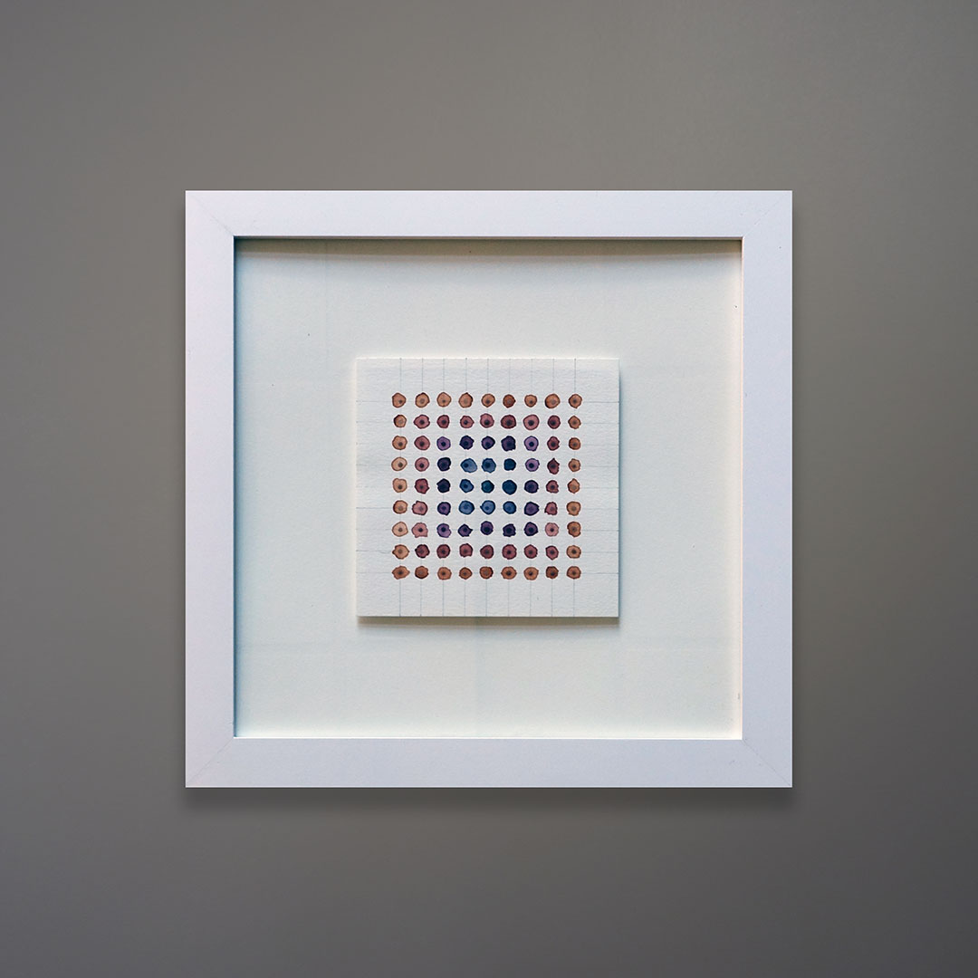 Original watercolor by Shelter Island artist Leah Peeks. This piece is 6 x 6 inches float framed in a 14 × 14 white wood frame. It is titled “Seasonal Sketches” signed and dated 2022.