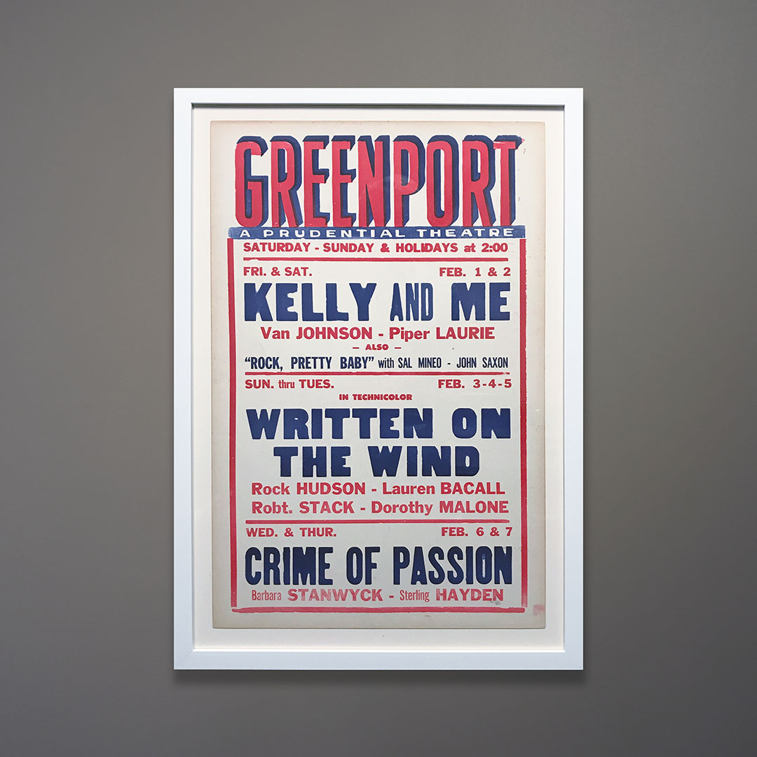 We have a large collection of original event and theatre posters offered for sale. They include advertisements for the Greenport movie theater on Front Street, the Greenport Sky-Way Drive-in on Route 25 (defunct), the John Drew Theater in East Hampton, as well as various parades, dances, and bazaars hosted by the Greenport NY Fire Department and other Greenport entities. These robust designs were either hand drawn or composed using wood type. The original posters were individually printed on manual offset platen presses one color at a time. The earliest one is 1926, but most are from the 1950-1970. This original poster is from 1957. 17 x 25 as framed in matte white wood.