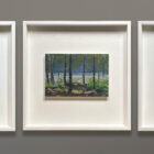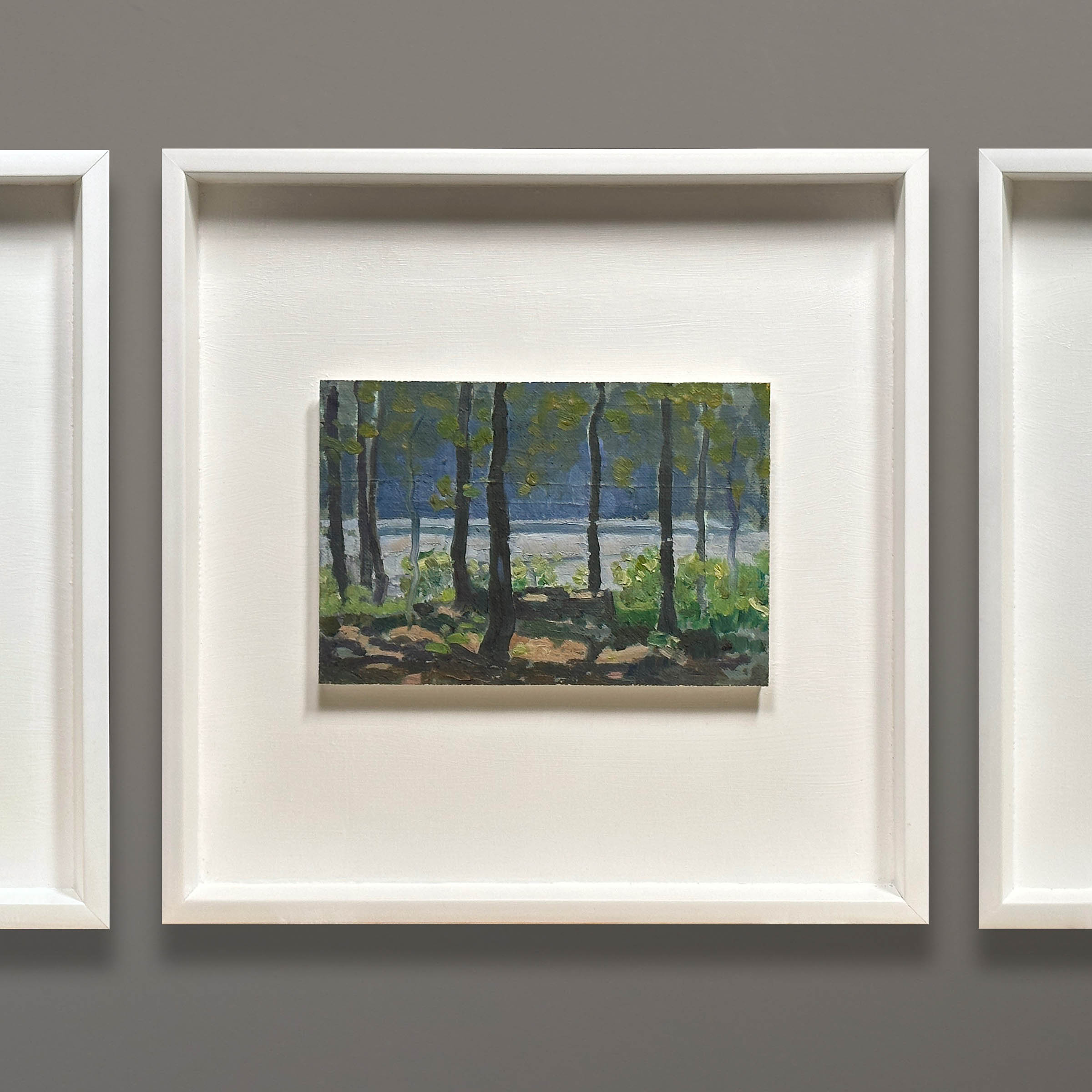 Offered here is an original plein air Impressionist oil painting on canvas board by Richard H. Bassett, unsigned, undated, circa 1930s. Float framed in white wood. Art size 7 × 11 inches, frame size 18 × 18 inches.