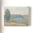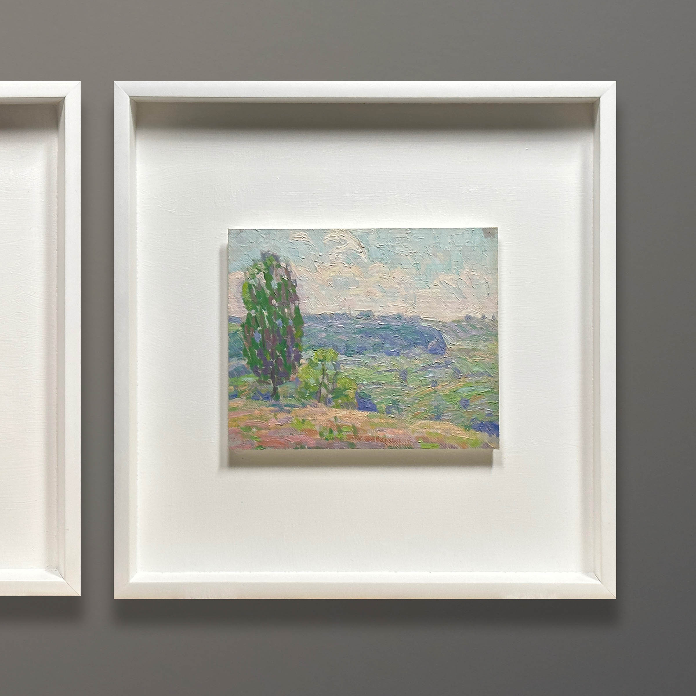 Offered here is an original Impressionist oil painting on canvas board by Richard Bassett, unsigned, undated, circa 1930s. Float framed in white wood. Art size 8 × 11 inches, frame size 18 × 18 inches.