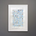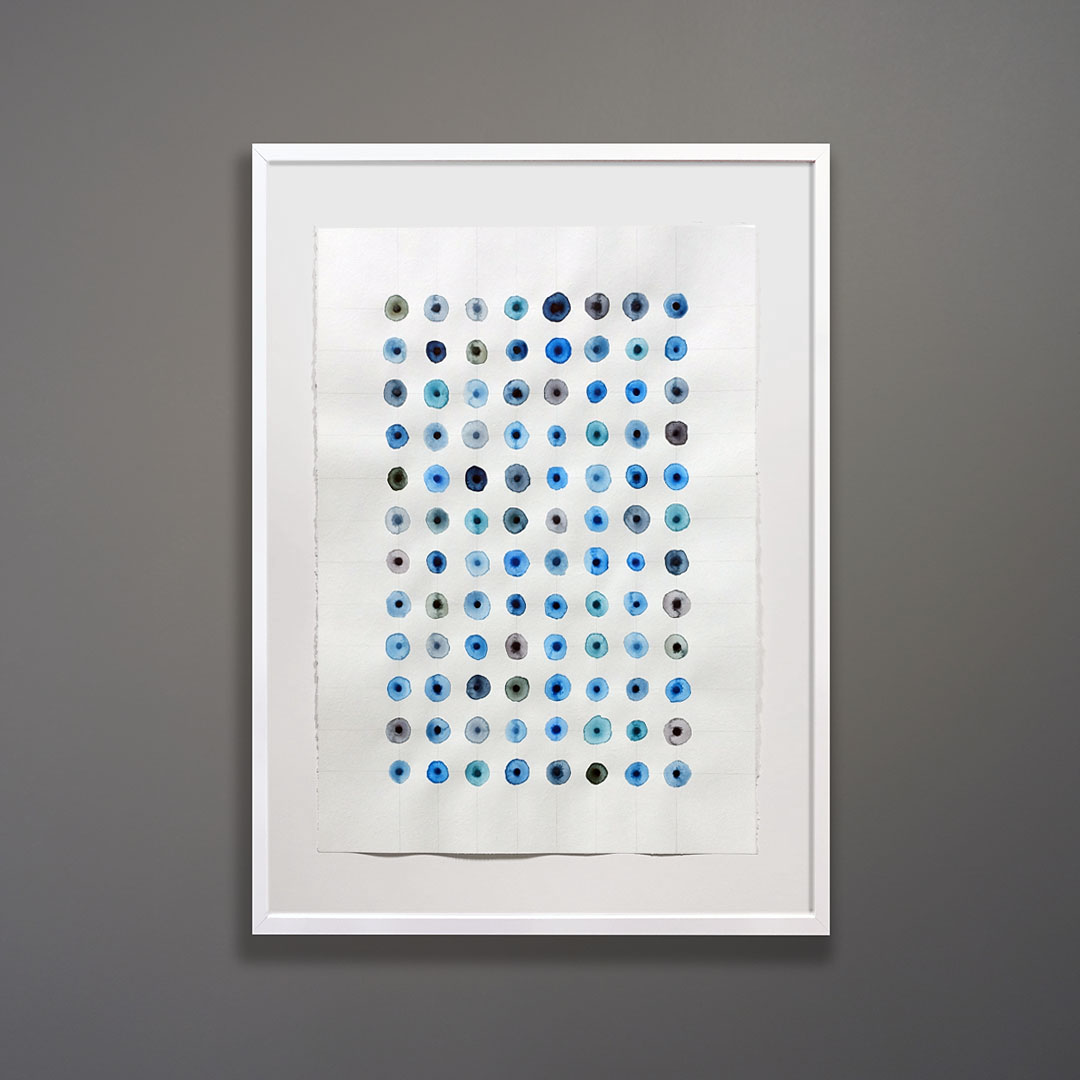Original watercolor painting “The One That Makes Me Feel Like I’m At the Beach” by Shelter Island artist Leah Peeks, 2021. Peeks drew inspiration from the Washington D.C. Color School painters of the 1950s, especially Sam Gilliam, while she was living in Virginia. This artwork is distinctive because of the way the pattern responds to the viewer’s eye. A sense of movement, an awareness of the near-perfect but also not-perfect design. It is float mounted in a minimalist white glss wood frame faced with gallery acrylic. The overall framed size is 32×40 inches. This artwork may be displayed horizontally or vertically. Signed on the back.