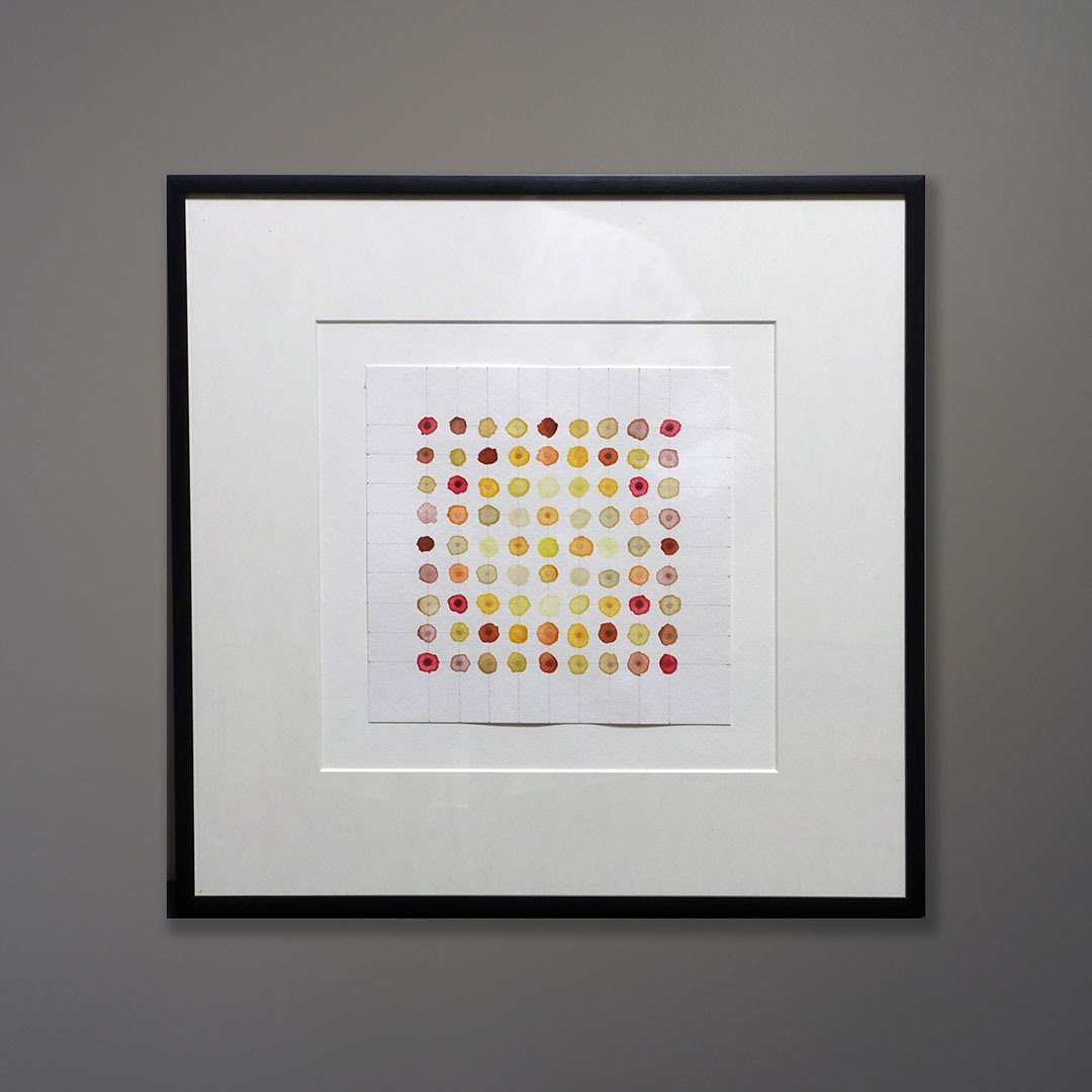 Original watercolor by Shelter Island artist Leah Peeks. This piece is 6 × 6 inches float framed in a 13 × 13 matte black aluminum frame. It is titled “Seasonal Sketches” signed and dated 2022.