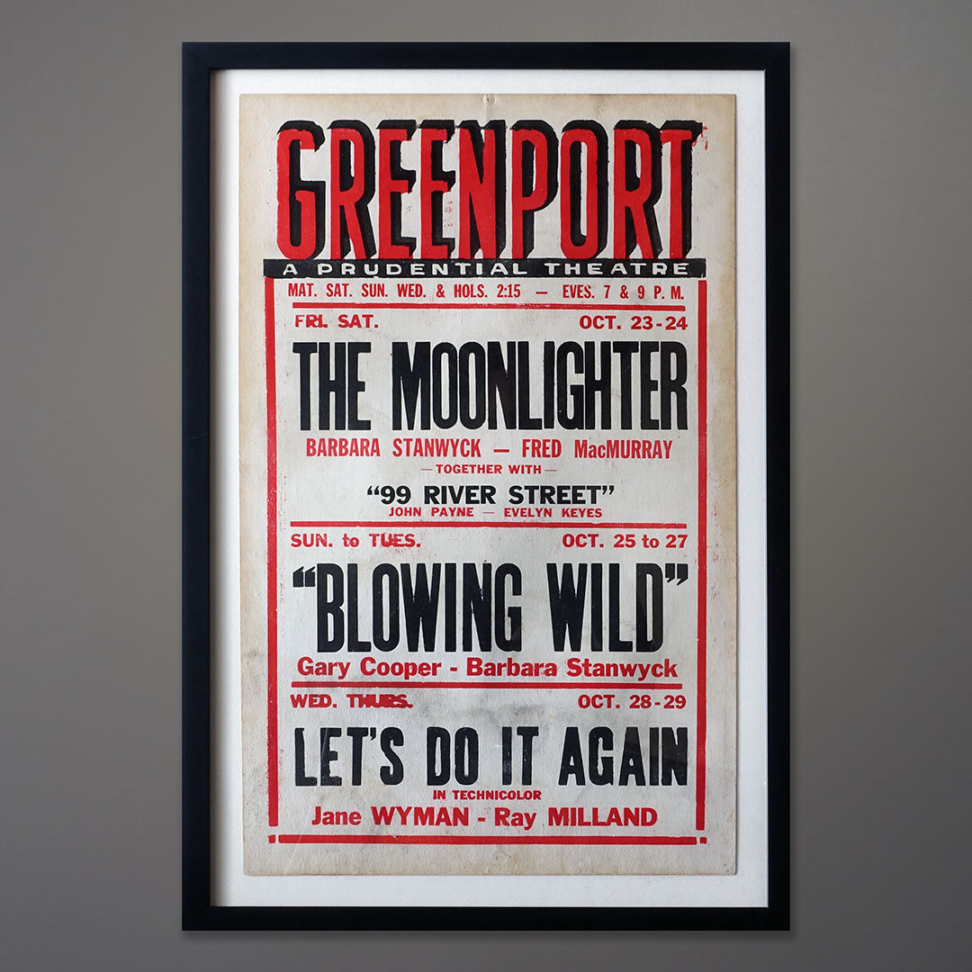 Such suggestive titles! Offered here is the original advertisement for the Greenport movie theater on Front Street. These robust designs were either hand drawn or composed using wood type. The original posters were individually printed on manual offset platen presses one color at a time.