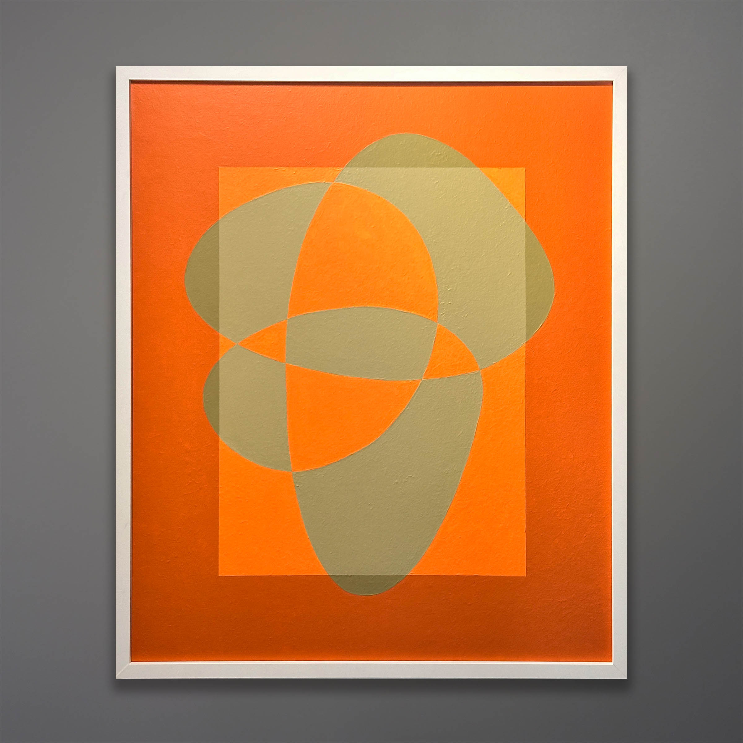 An original polymer painting by Michael Aron “Flight III” (2022) 35×42 inches as framed in matte white.