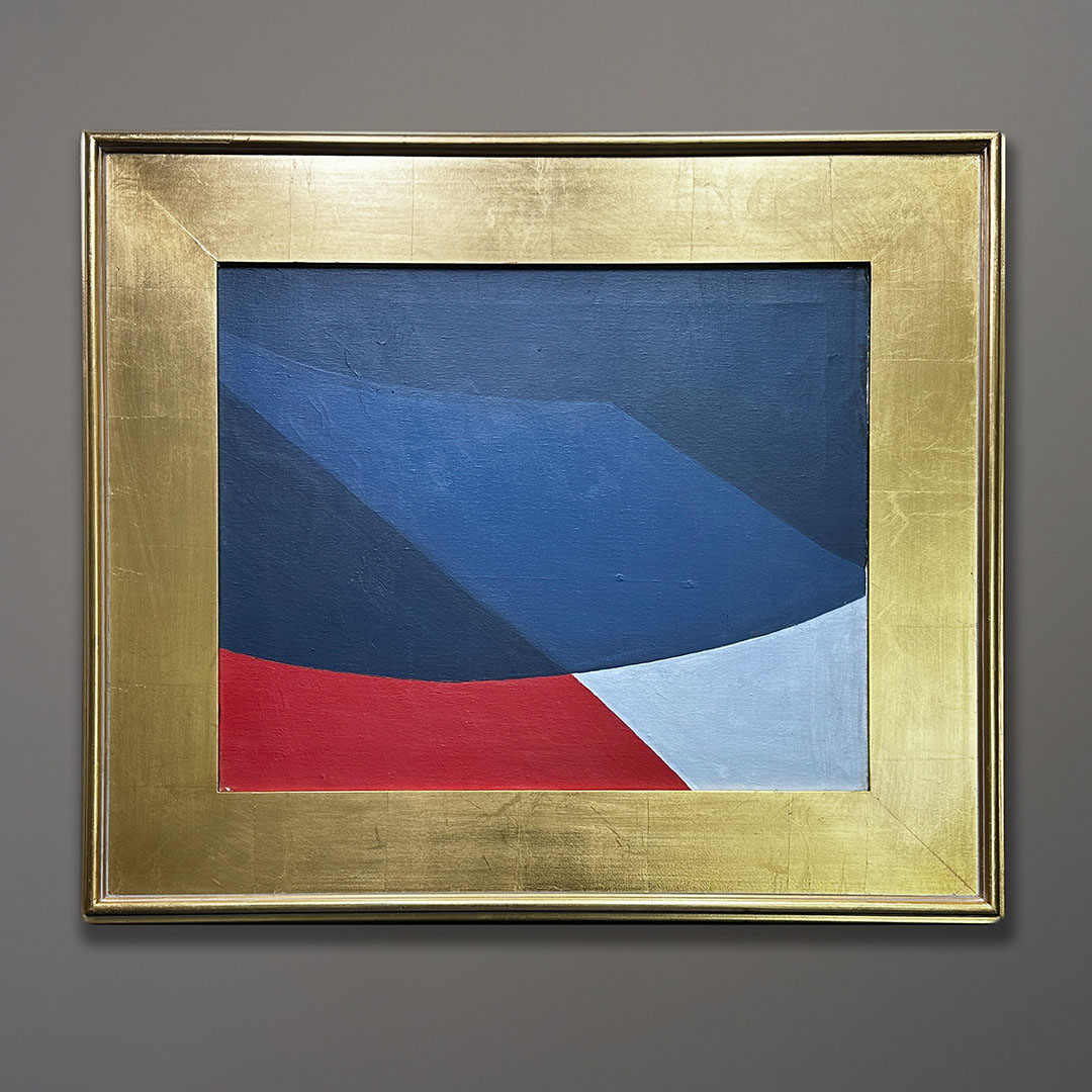 This abstract painting was done by Constance Leonetti in the late 1960s or early 1970s. It is 30×34 inches as framed in gold leaf over wood. Signed on the back. We think it’s brilliant. The canvas show signs of time but has no damage.