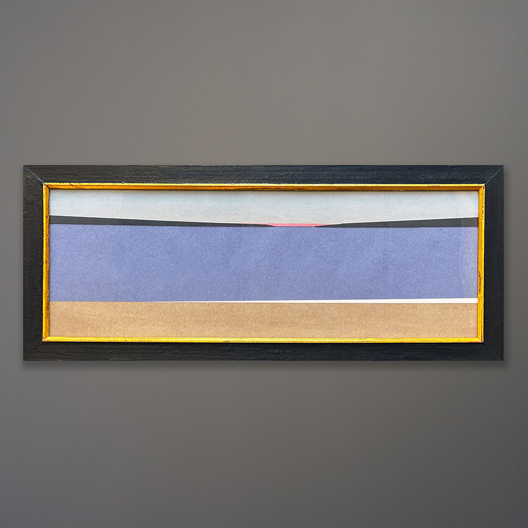 Offered here is an original paper collage by Michael Aron “Sunset Beach” 2022. It is 10×24 inches in a distressed vintage frame with acrylic glazing. Michael Aron studied art and design at the Wooster School in Ridgefield, CT; The Academy for Fine Art and Design in Genk, Belgium; Syracuse University; and got his BFA from the Cooper Union for the Advancement of Science and Art in NYC. He lives in Brooklyn and Greenport and is the proprietor of Ray New York.