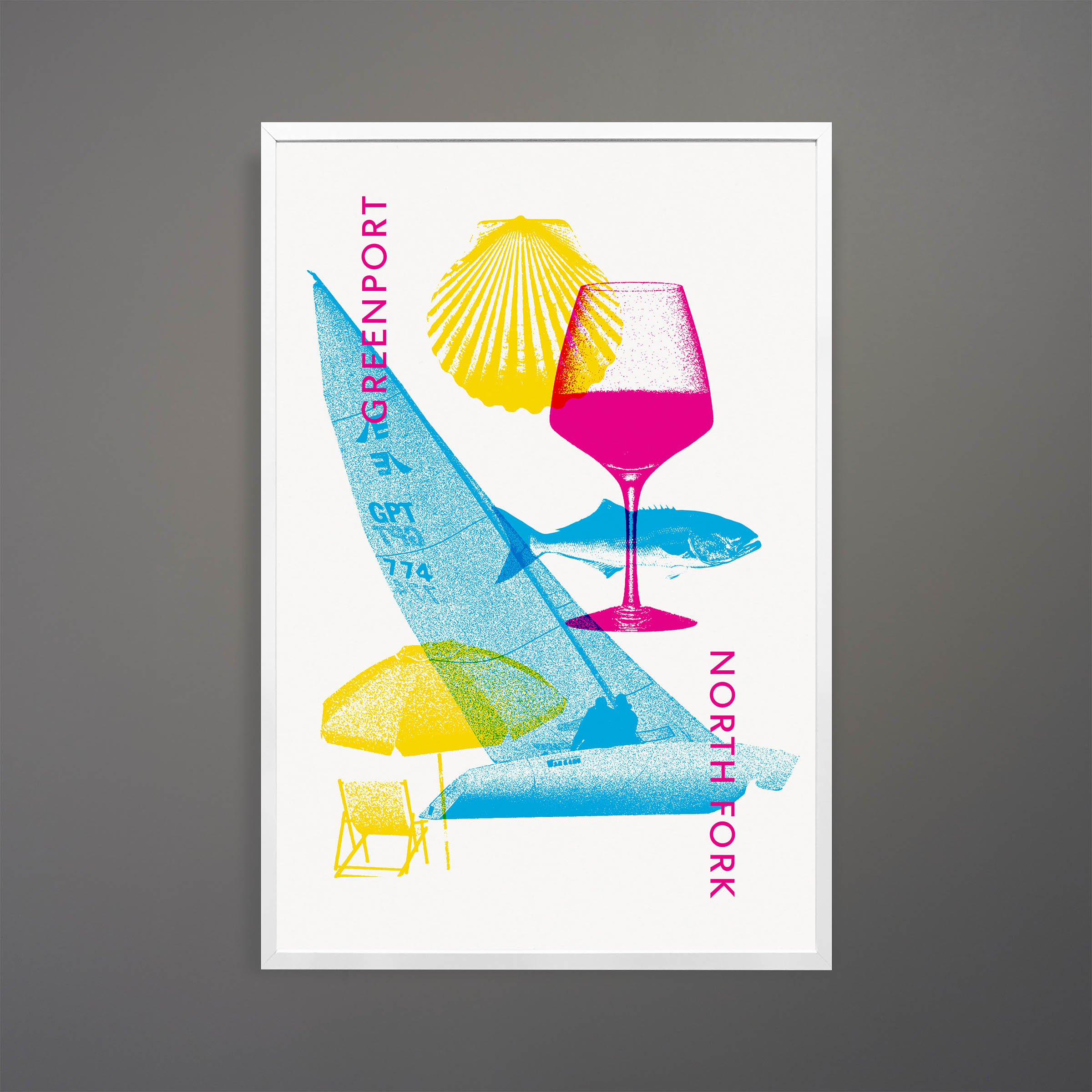 We offer here a series of posters for North Fork residents (past & present), visitors, and poster aficionados. Designed and produced by Michael Aron, proprietor of Ray New York. Each poster is signed and numbered in an edition of ten. They are fine art, gallery-quality pigment prints on matte archival paper using fade-free 12-color archival inks for crisp contrasts and 100-year longevity. The size is 24 × 36 inches, with the frame 27 × 39 inches.