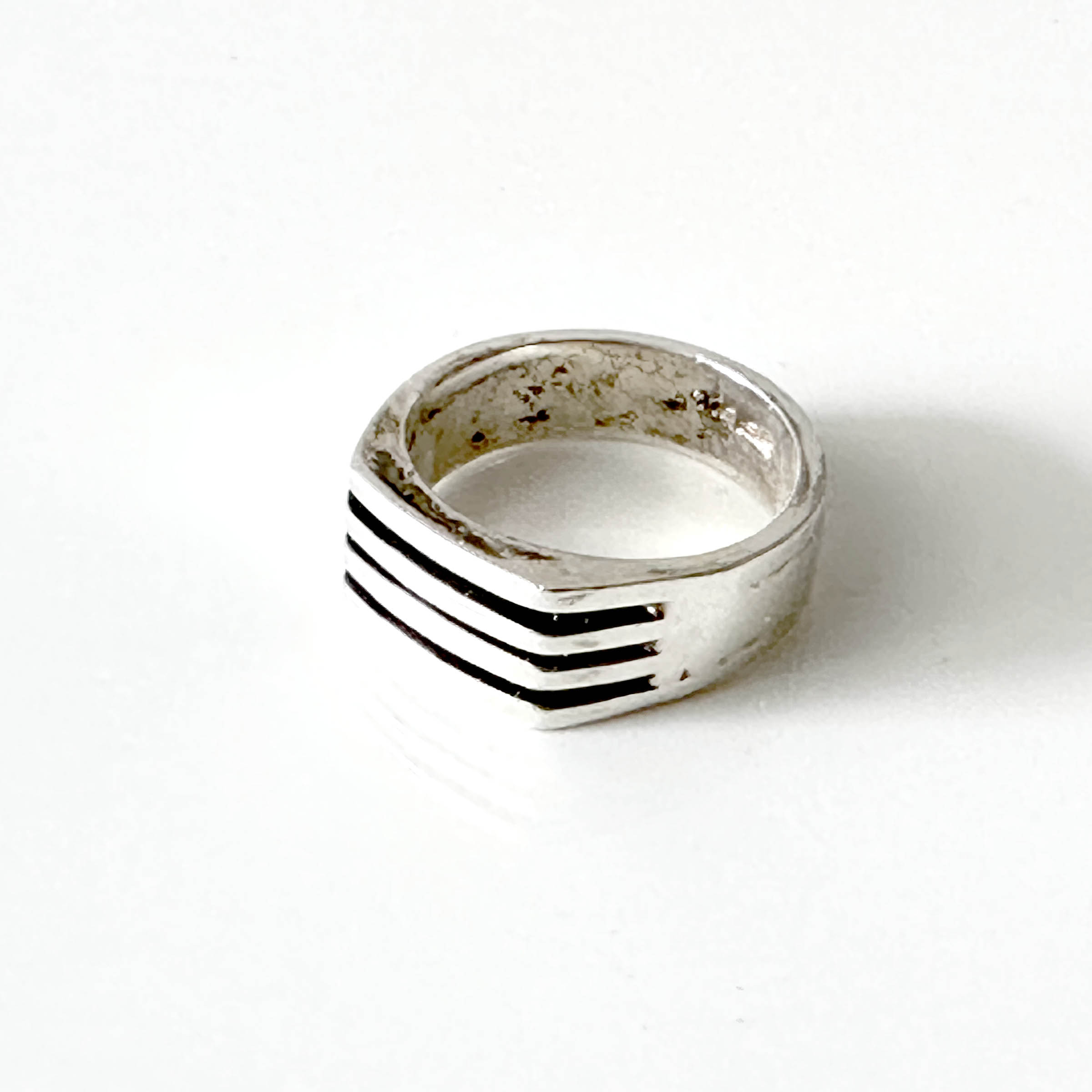 Modernist artisan sterling silver saddle ring with slotted stripe front. Made from four bands of silver laminated and shaped. Stamped: “Sterling,” size 9.5.