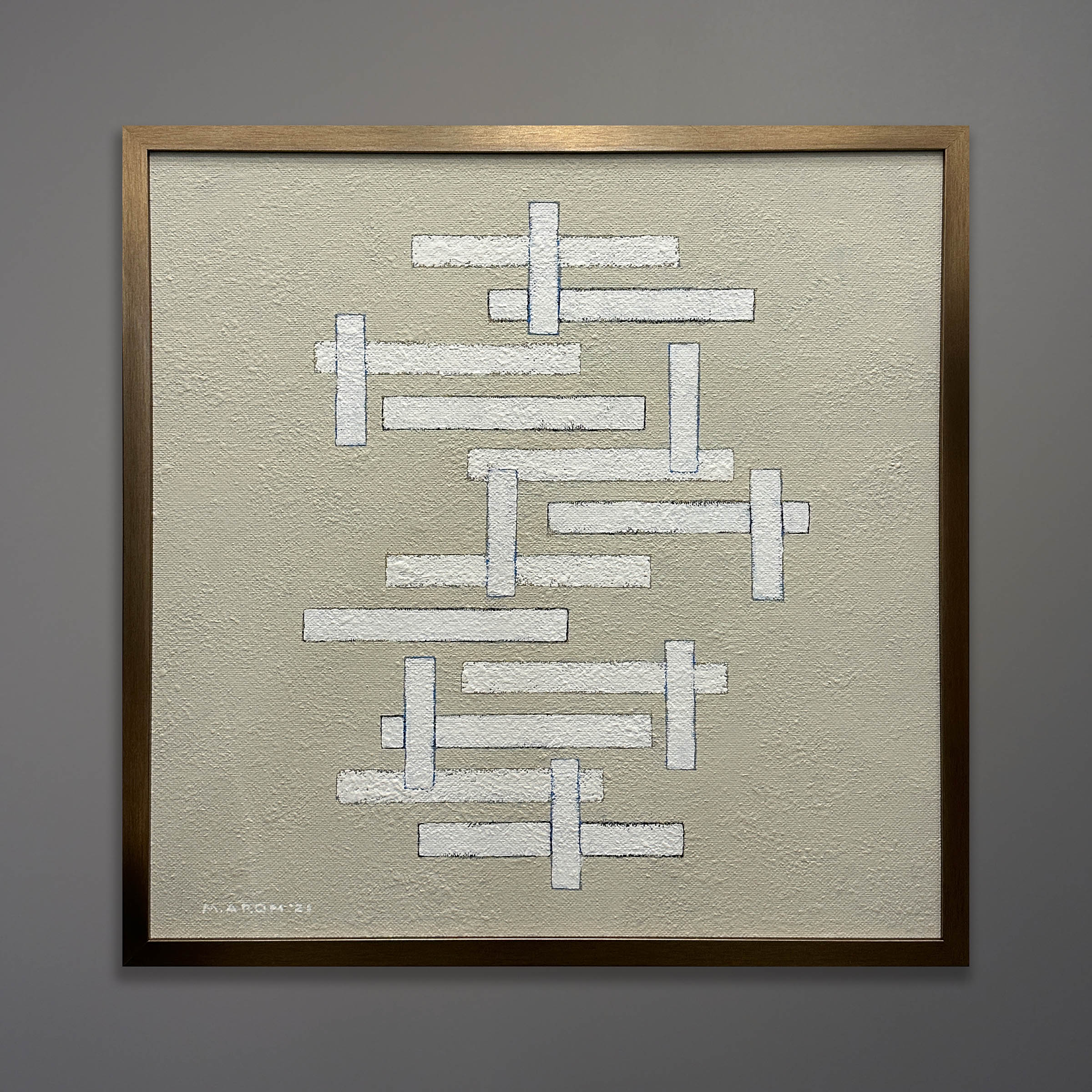 An original polymer painting on masonite by Michael Aron titled “Interlocking” dated 2021. This abstract work was inspired by the artists Josef Albers and Kazimir Malevich. Framed in soft bronzed wood, 25×25 inches.