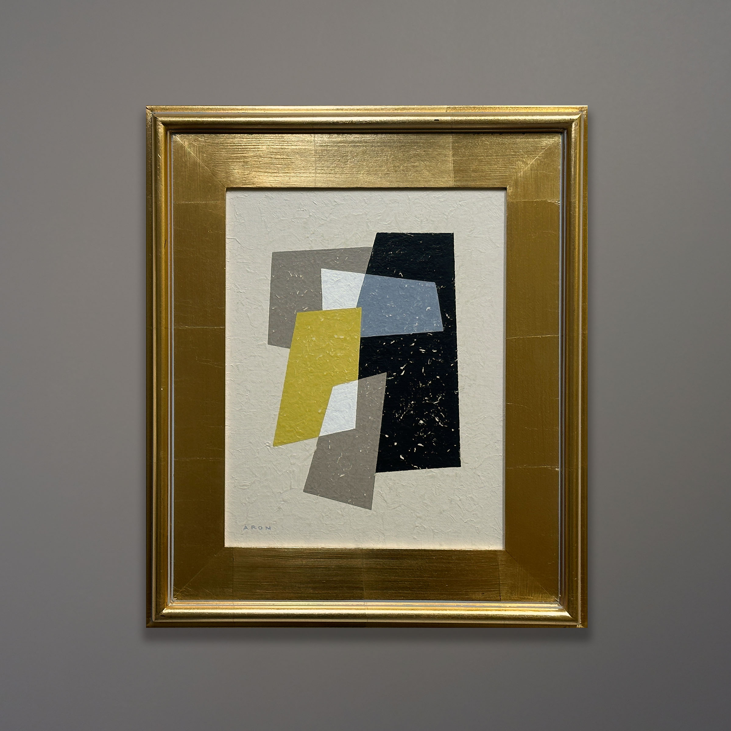 An original polymer painting on masonite by Michael Aron titled “Quicksilver” dated 2023. This abstract work was inspired by the artist Charles Green Shaw and Kazimir Malevich. Framed in a 17×20 inch gold leaf wood frame.