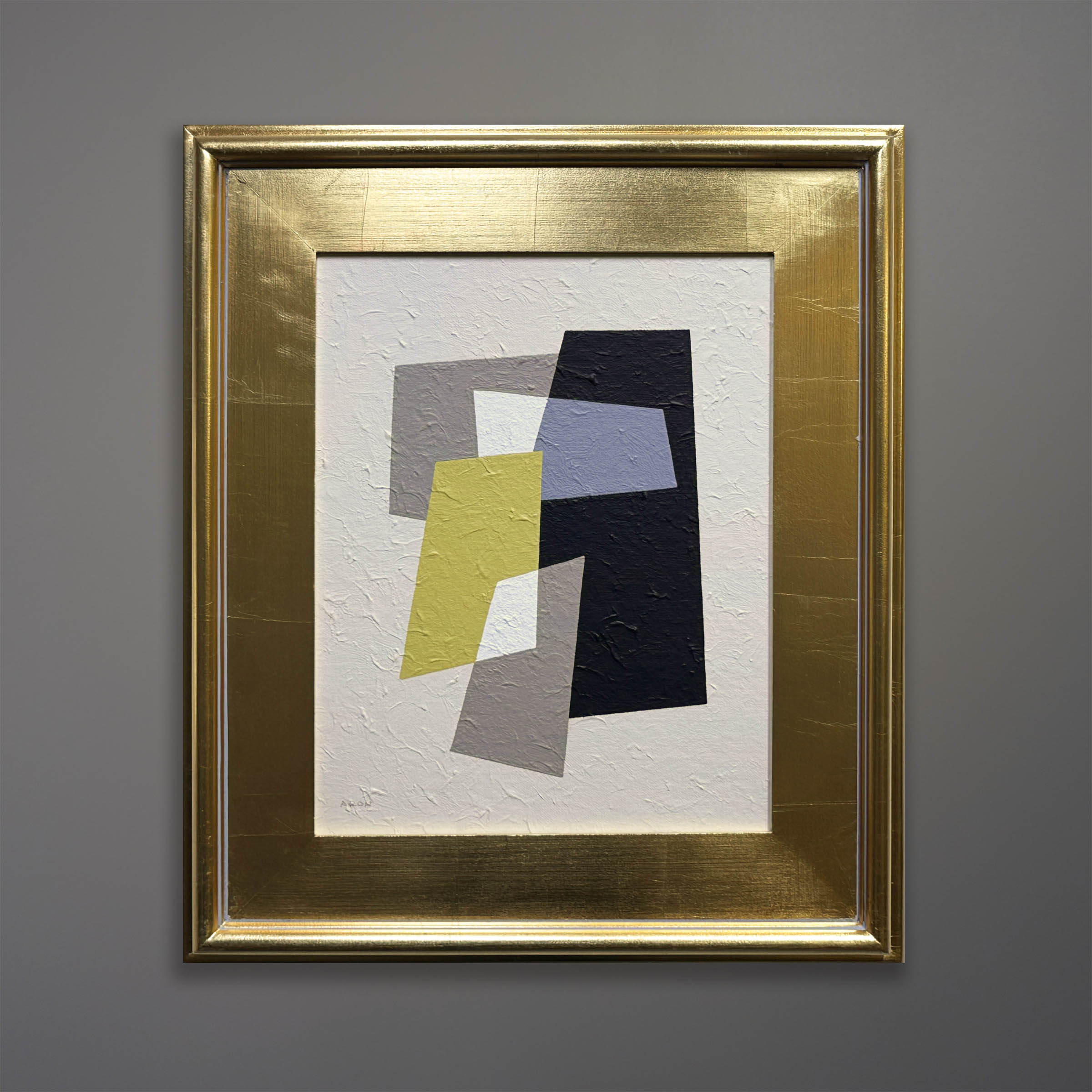 An original polymer painting on canvas board by Michael Aron titled “Quicksilver II” dated 2023. This abstract work was inspired by the artist Charles Green Shaw and Kazimir Malevich. Framed in a 17×20 inch gold leafed wood frame.