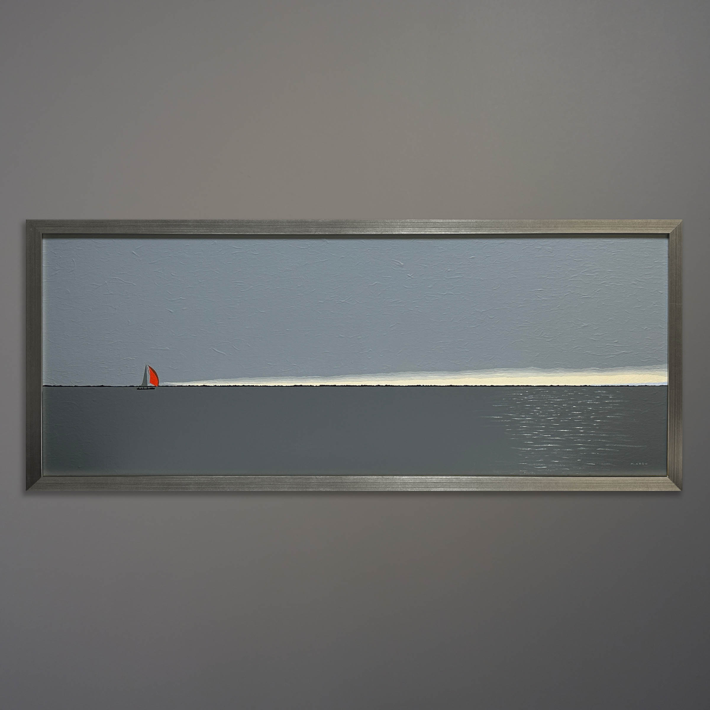 An original polymer painting on canvas by Michael Aron, 2023, titled “Peconic Bay VI.” Based on a photograph by Nola Lopez. It depicts the setting sun over Southold. The body of water is often called Peconic Bay but it is actually the Peconic River. This sailboat with a red spinnaker is a common sight here at dusk on the North Fork of Long Island. The overall size is 18×42 inches as framed in silver MDF.
