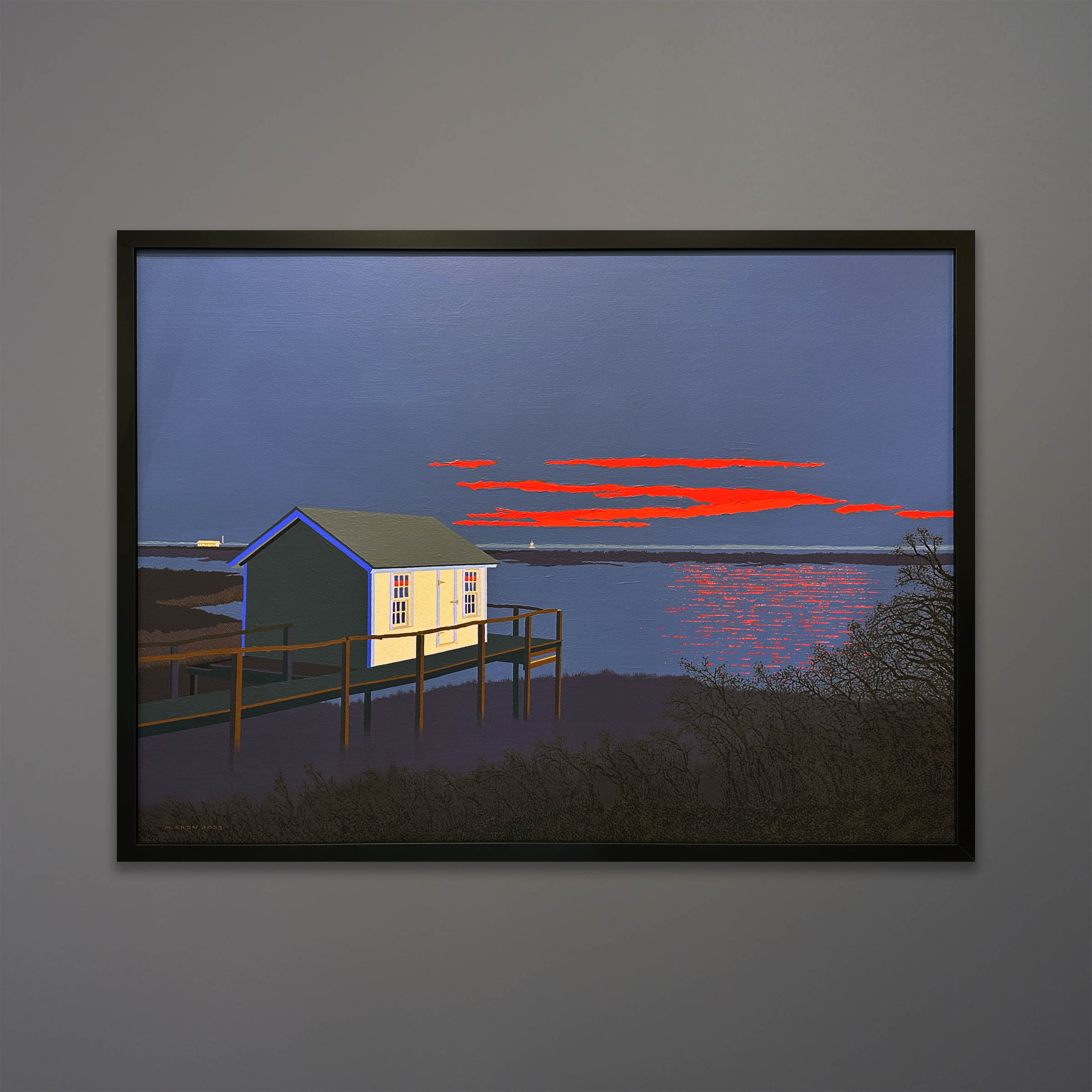 An original polymer painting on canvas by Michael Aron, 2023, titled “Magic Hour II”. It depicts the “Old Crab Shack” a familiar landmark on the way to Orient NY. The overall size is 51×39 inches as framed in matte black wood.