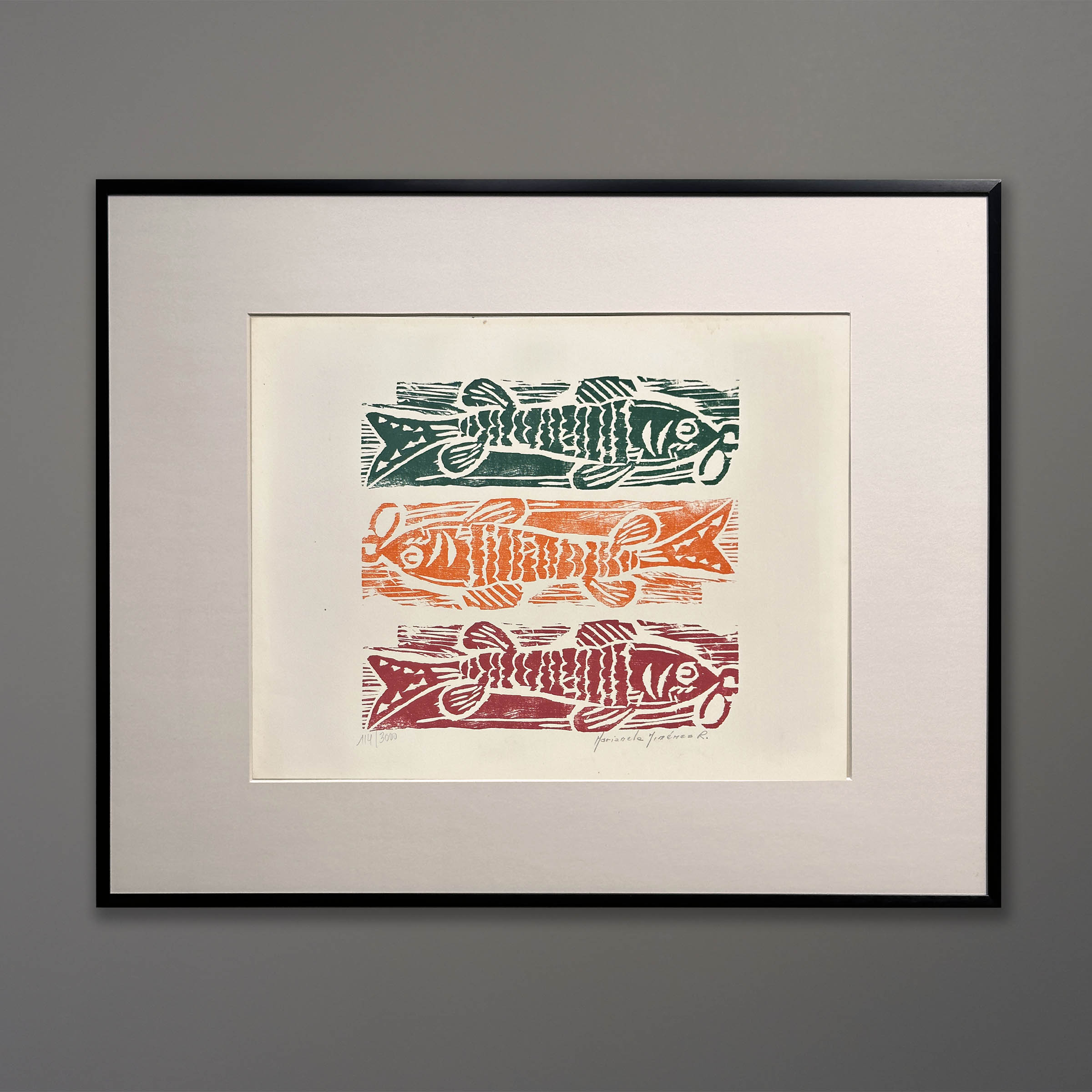 Three Fish woodcut print. Club de Grabado de Montevideo distributed prints by well-known artists as part of a government program to increase awareness of art and culture. These limited edition wood block prints are now collector’s items. Montevideo is the capital of Uruguay and was a meeting place for abstract artists many of whom were trained in Europe. This original print measures 20×16 inches as framed in matte black aluminum. It is signed by Marianela Jimenéz R. and is untitled. Printed in Uruguay, 1975. Marked with the edition number 114/3000.