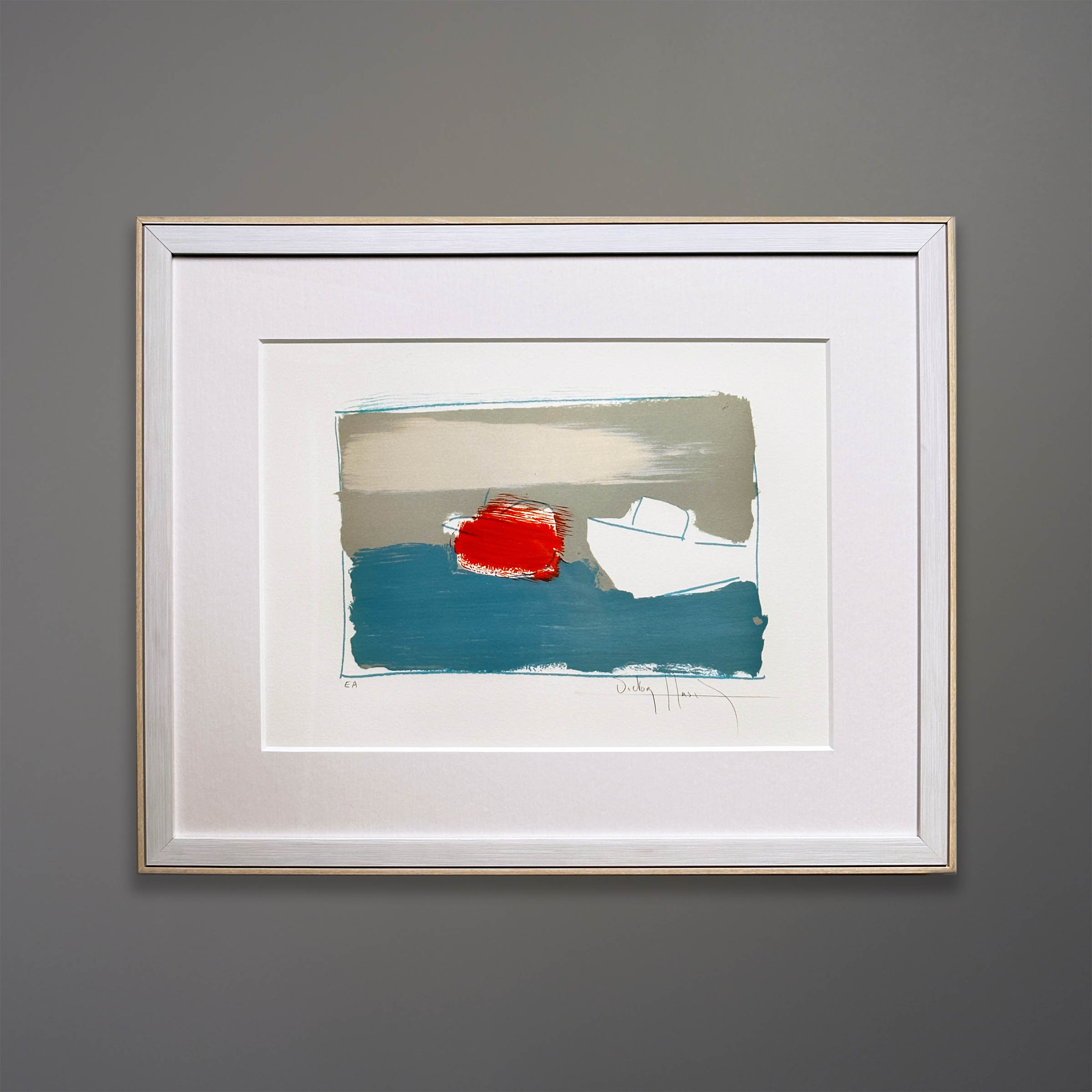 Offered here is a 1980s stone lithograph “Marine” by the French artist Victor Hasch (1945-2012). Matted in 8-ply acid-free board in a white wood frame trimmed with oak edges, 21×17 inches. Marked “EA” (artist’s edition.) Hasch exhibited extensively in Cannes, Nancy and Geneva.