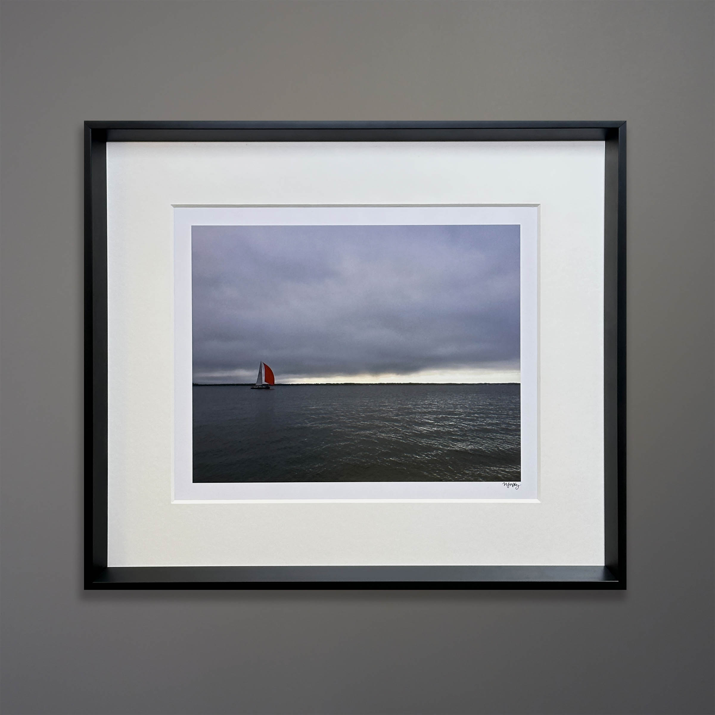 This sailboat with the red spinnaker is often seen near the shores along Peconic Bay here on the North Fork. Nola Lopez captured it off Bootleg Alley on Shelter Island. The evening clouds were just rolling in. 23×20 inches as framed in black wood with an 8-ply acid-free mat.