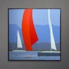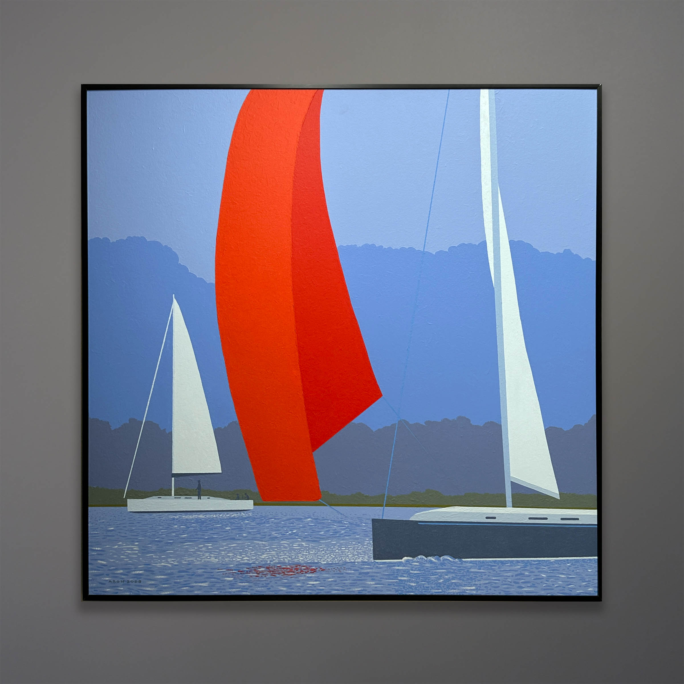 Offered here is an original painting on board by Michael Aron “Peconic Bay Race” 2023. 36½ × 36½ as framed in matte black aluminum. The yacht in the foreground is Alliance a familiar sight on these local Peconic Bay waters. She was just unfurling her distinctive red spinnaker to catch the wind. Shelter Island is in the background.