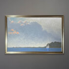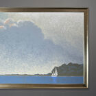 Offered here is an original painting by Michael Aron “Peconic Bay Sloop” 2023. 66×42 inches as framed in silver leafed wood.