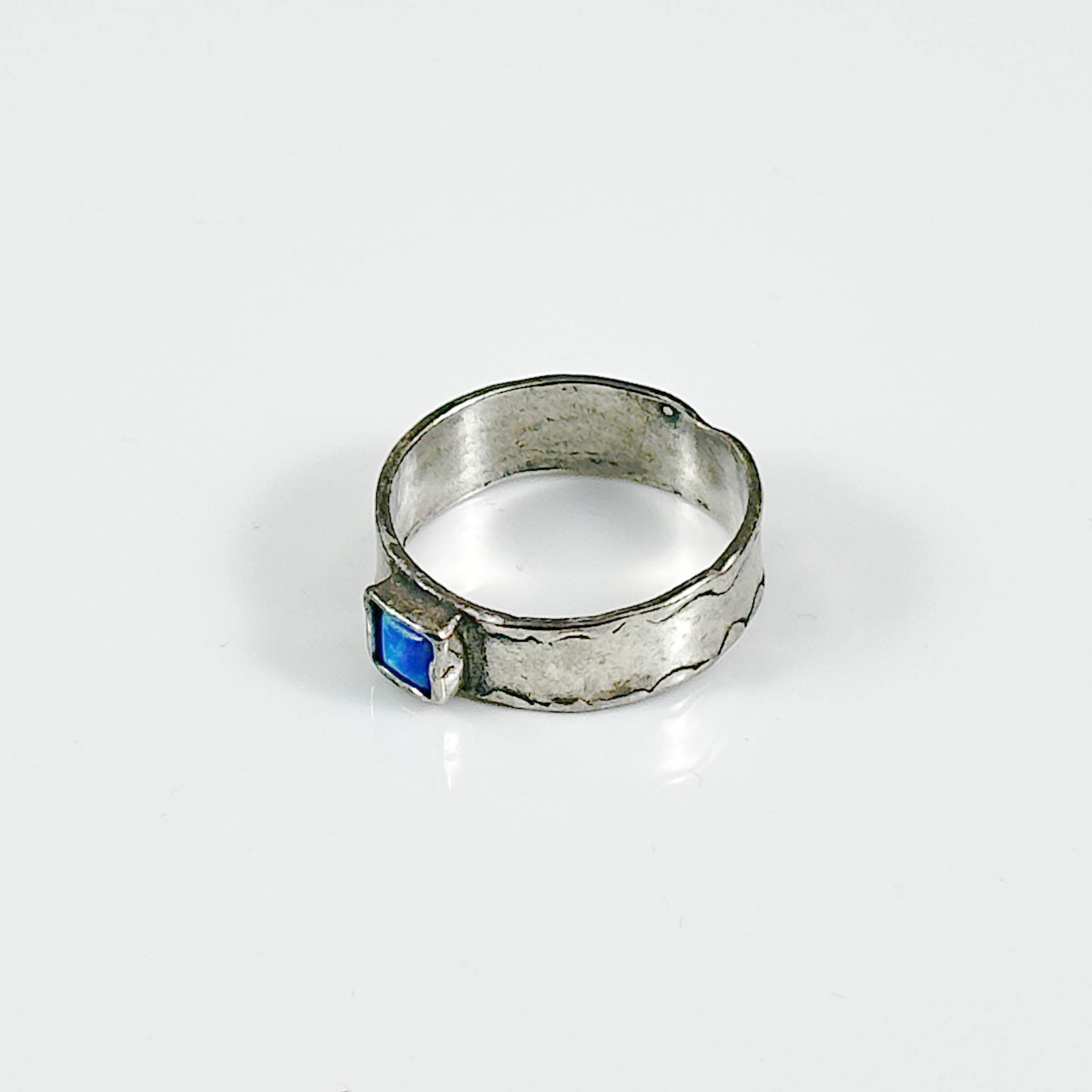Vintage artisan-made Sterling silver ragged-edge band with a square bezel set Black Opal stone. Size 8½. Circa 1970s or 1980s.