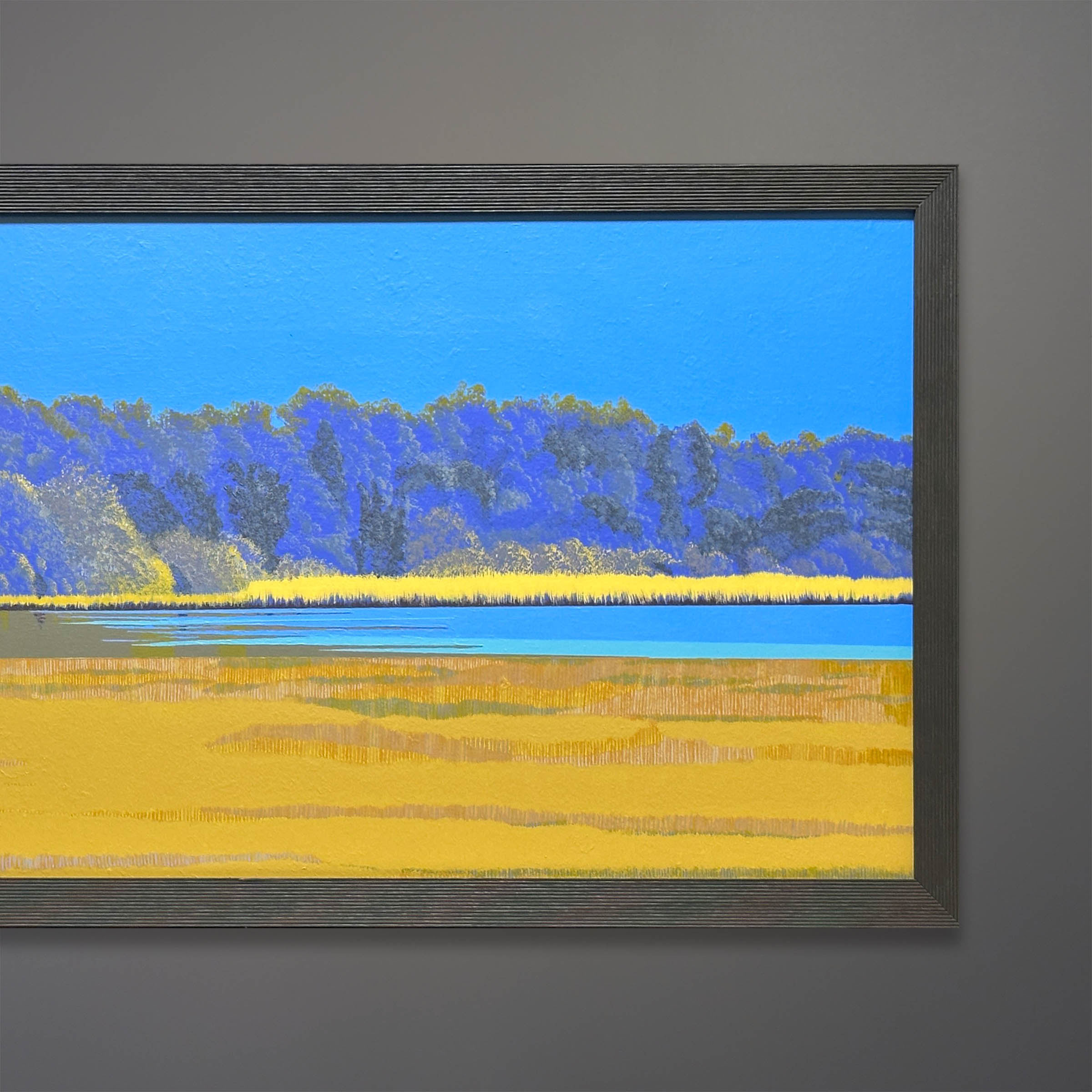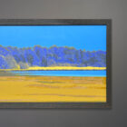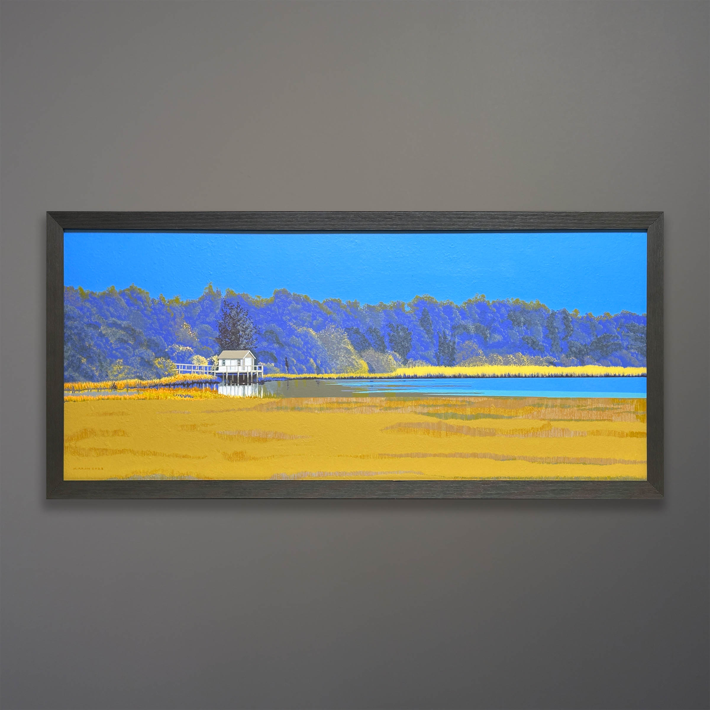 Offered here is an original painting on board by Michael Aron “Crab Shack Reflected” 2023. 51×23 as framed in charcoal gray wood frame. It depicts “The Old Crab Shack” near Orient, NY. This structure, a former club house for a nearby hotel’s kitchen staff, sits overlooking a marsh rich with waterfowl, scallops, clams, and oysters. These guys were called “The Old Crabs.”