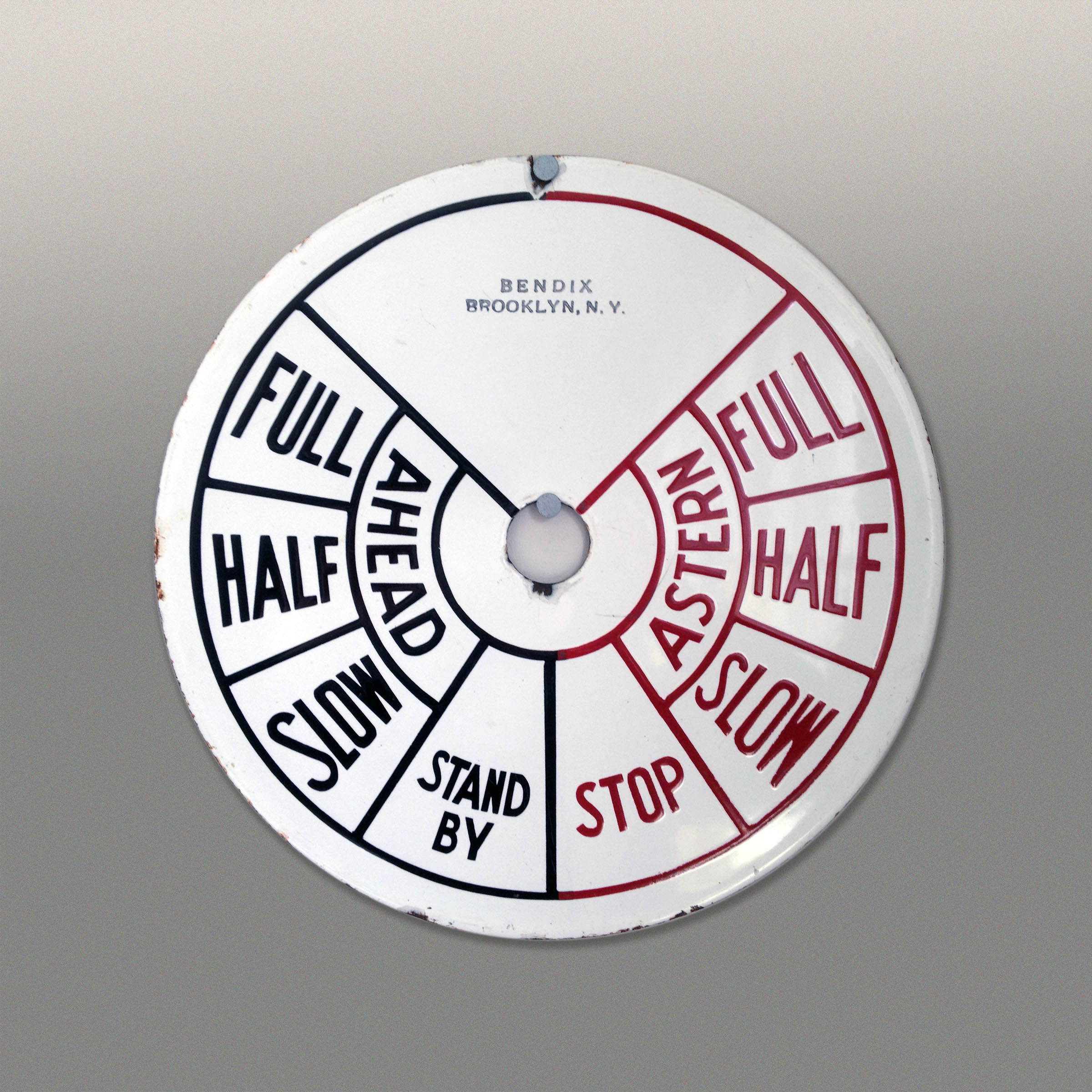 We are fans of utilitarian typography. This item, a ship’s speed controller or engine throttle, has the best example. Excellent flared lettering to define the ship’s speeds fore and aft. “Bendix Brooklyn NY”. Enamel on steel. A small spot of wear on the side. 12 inch diameter.