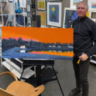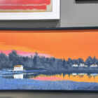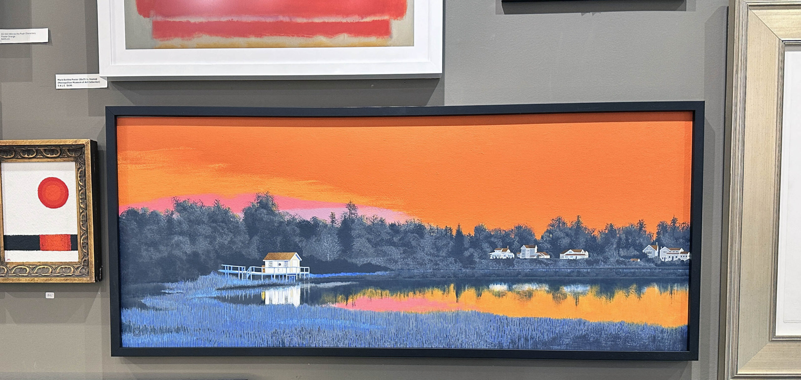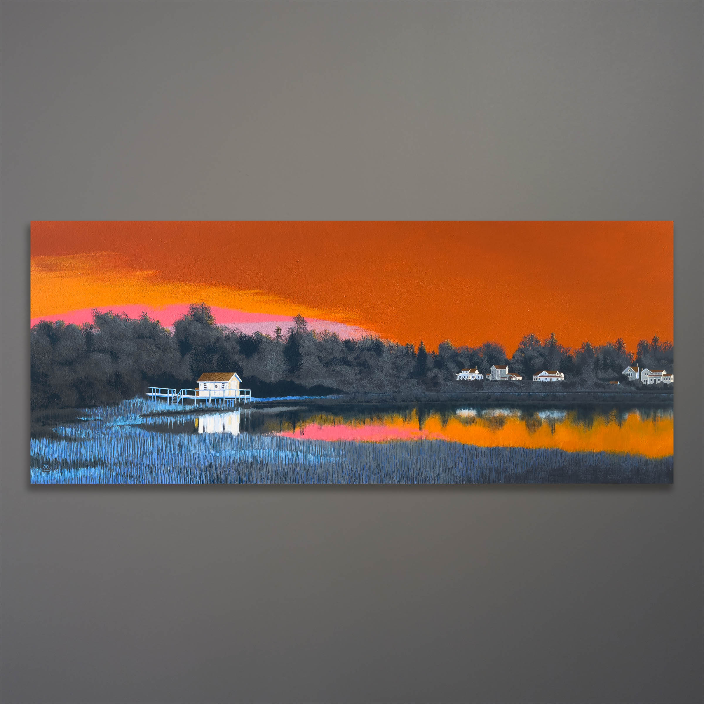 Original painting on board by Michael Aron “Crab Shack Christmas” 2024. 51×23 inches. Framed in matte black wood. The painting is based on my photo taken Christmas Day 2023. It depicts the Old Crab Shack, a small club house on stilts in the marsh adjacent to Orient, New York.