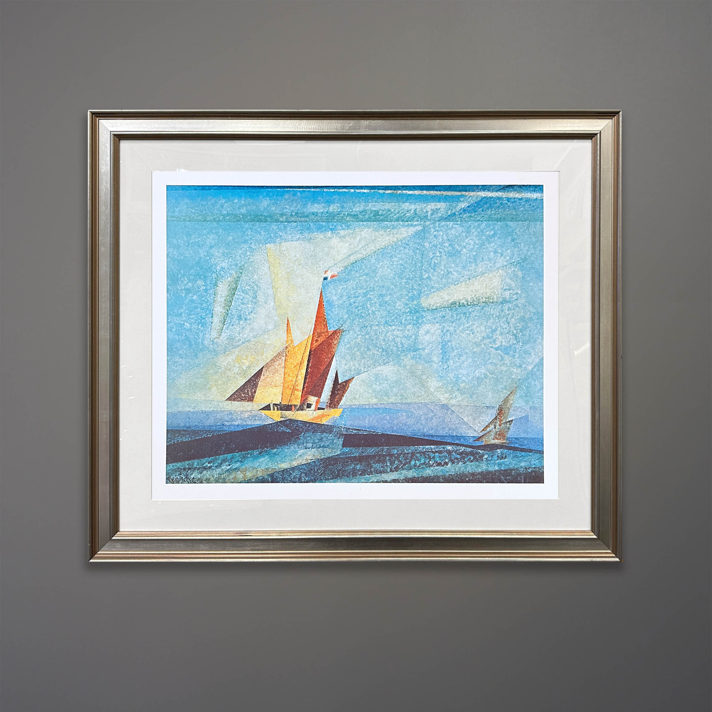 This vintage 1972 offset lithograph was produced by Penn Prints, New York. It is a fine art reproduction of a 1932 painting by Lyonel Feininger titled “Western Sea.” The original painting is in the permanent collection of D’Amour Museum of Fine Arts in Springfield, MA. We assume this print was sold in their gift shop in the Mid-Century. 20 × 24 inches framed size. Allow 2 weeks for framing.