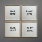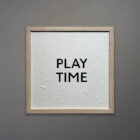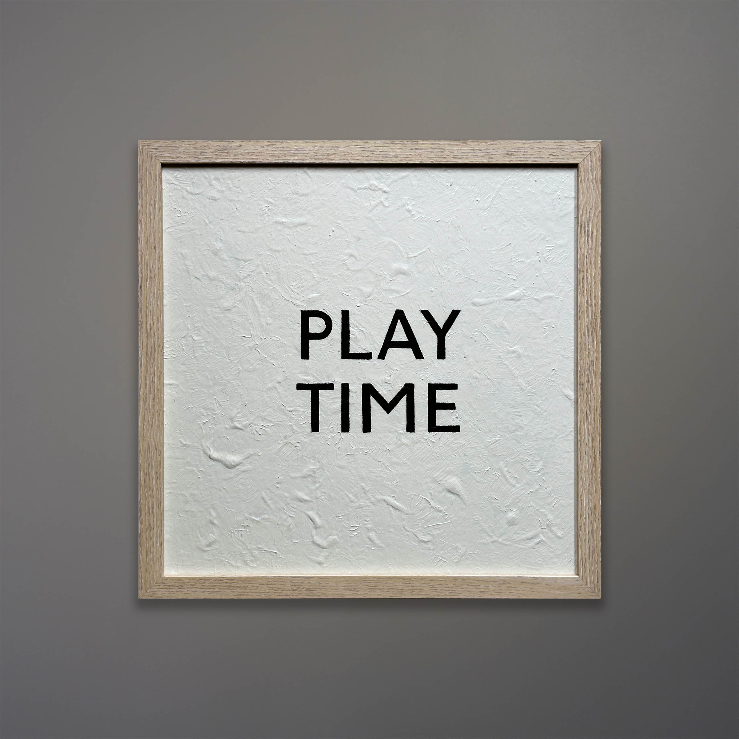 An original polymer painting on canvas by Michael Aron, 2024, titled “Play Time”. The overall size is 14×14 inches as framed in natural wood.