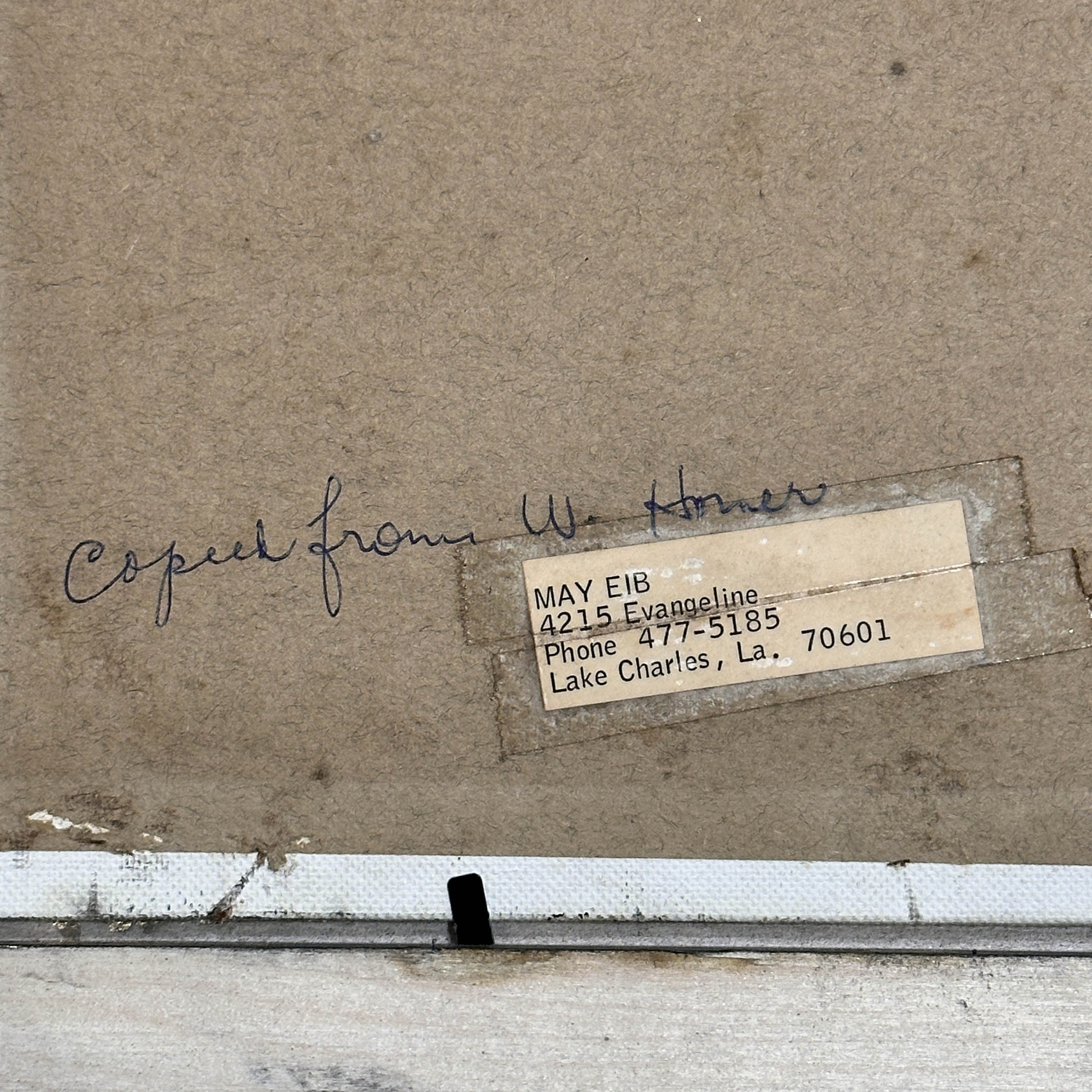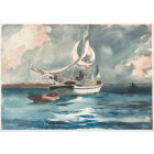 Offered here is an original oil painting signed “May” and dated 1967. We added a new gold leaf plein aire frame. 30×26 inches. Superb, confident brushwork. The Louisiana artist, May Eib, was copying a small 1899 watercolor by Winslow Homer titled “Sloop, Bermuda.” Identifying information and ink signature on the verso. We’ve included an image of the original Winslow Homer watercolor in the permanent collection of the Metropolitan Museum of Art in NYC.