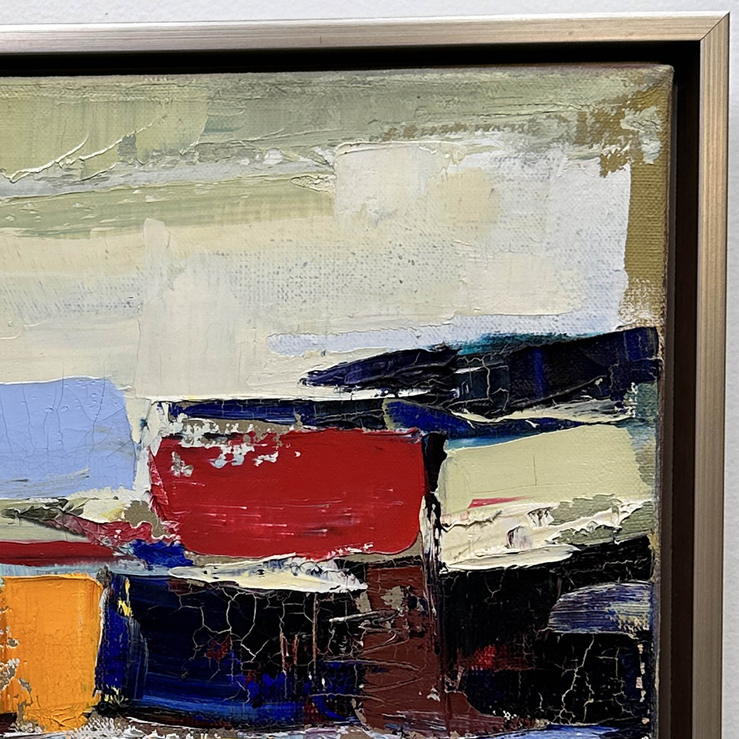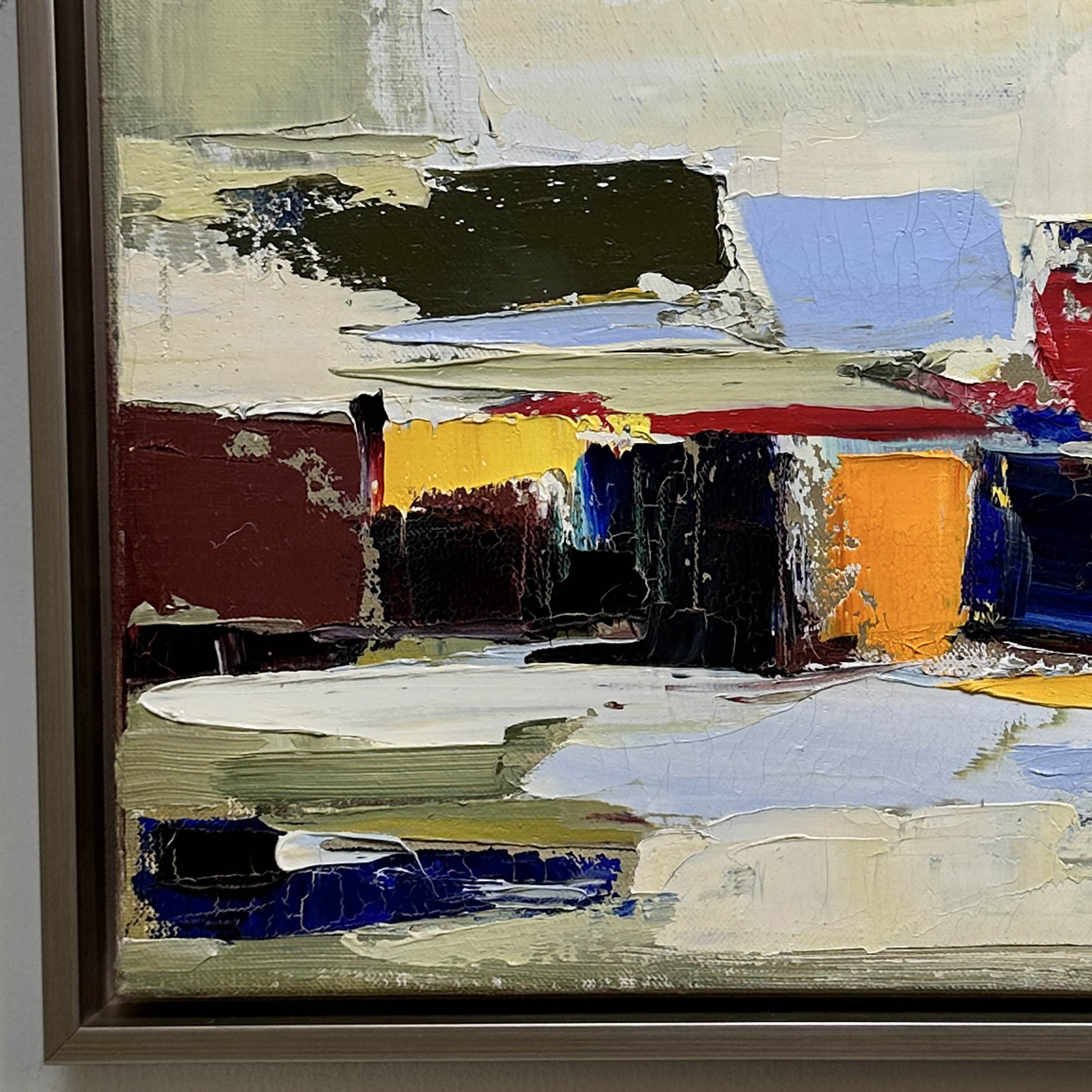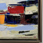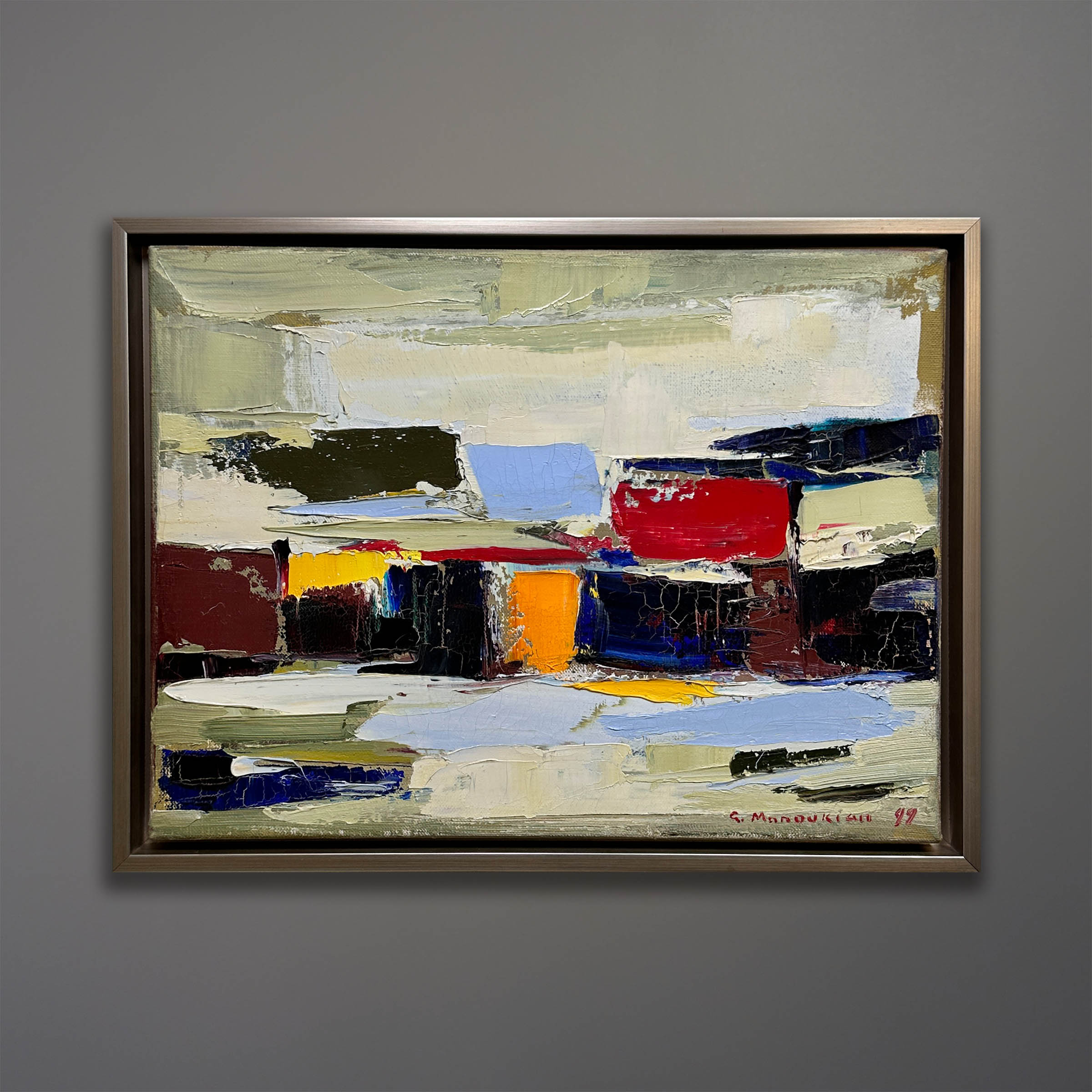 Offered here is an original abstract oil painting on linen signed by Gagik Manoukian and dated 1999. It measures 17×13 inches as float framed in warm silver gilt over wood. This painting is reminiscent of Hans Hoffman and Nicolas de Staël. Gagik Manoukian was born in 1952 in Yerevan, Armenia. Manoukian lives and exhibits in Prague, Czech Republic. Manoukian’s paintings can be found in public and private collections worldwide.