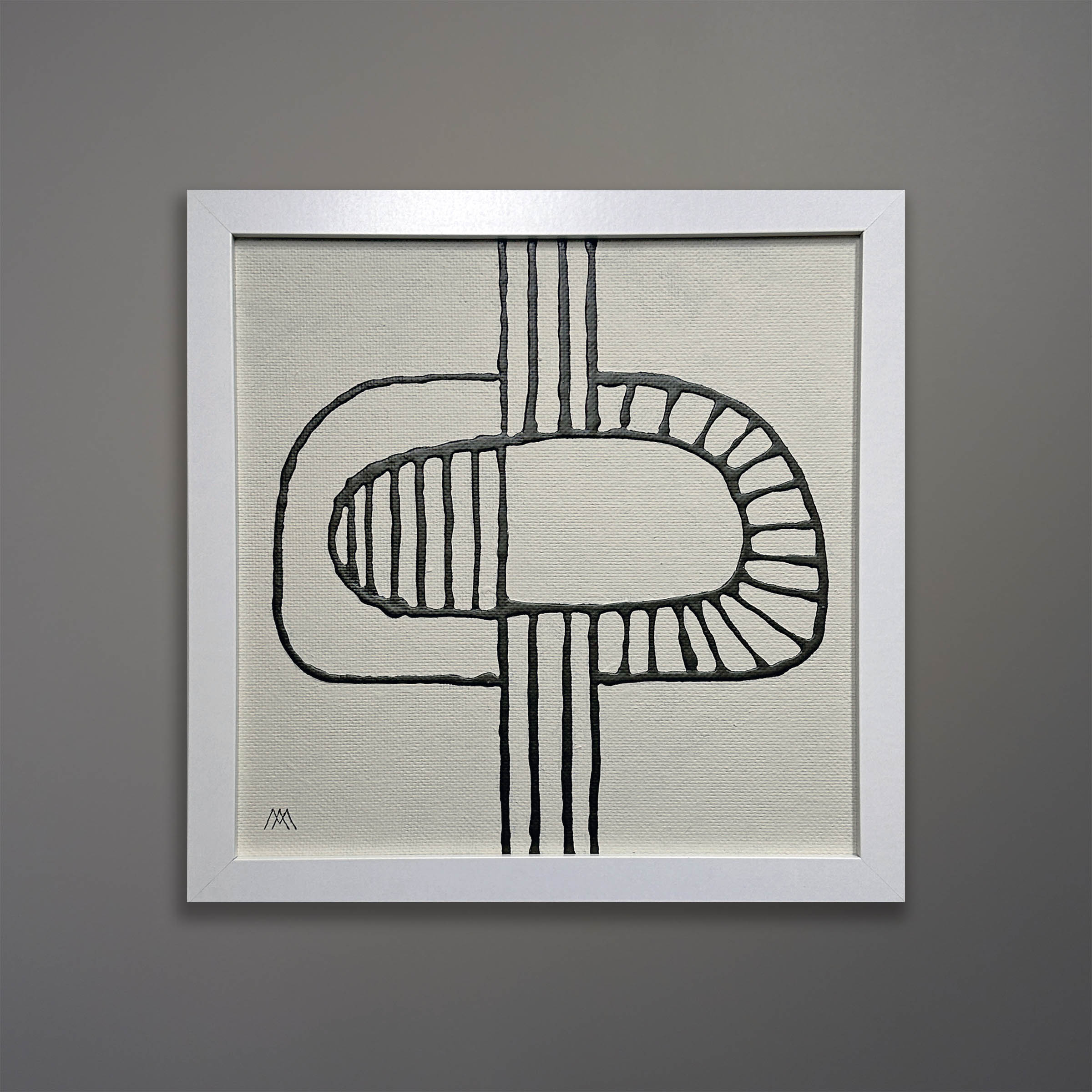An original polymer painting on board by Michael Aron, 2024, titled “Either Way”. The overall size is 13×13 inches as framed in white MDF. This design concept was borrowed from a 1970s vase from Lapid Pottery Works, Israel.