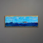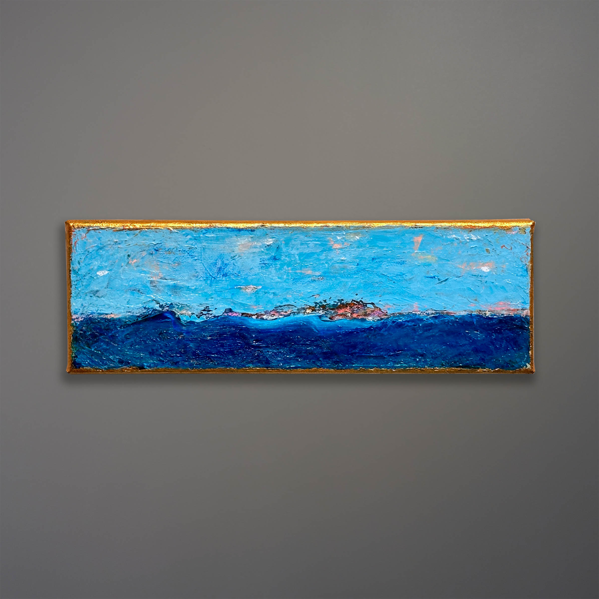 Abstract painting by Charles Huschle, 2024. The diminutive size of this painting gives it a unique jewel-like quality. Confident brushwork and excellent color make it quite special. Edged in gold. 12 × 4 inches. Currently unframed. Looks great with his other, similar painting. Huschle splits his time between here on the North Fork of Long Island and France.