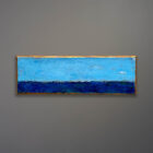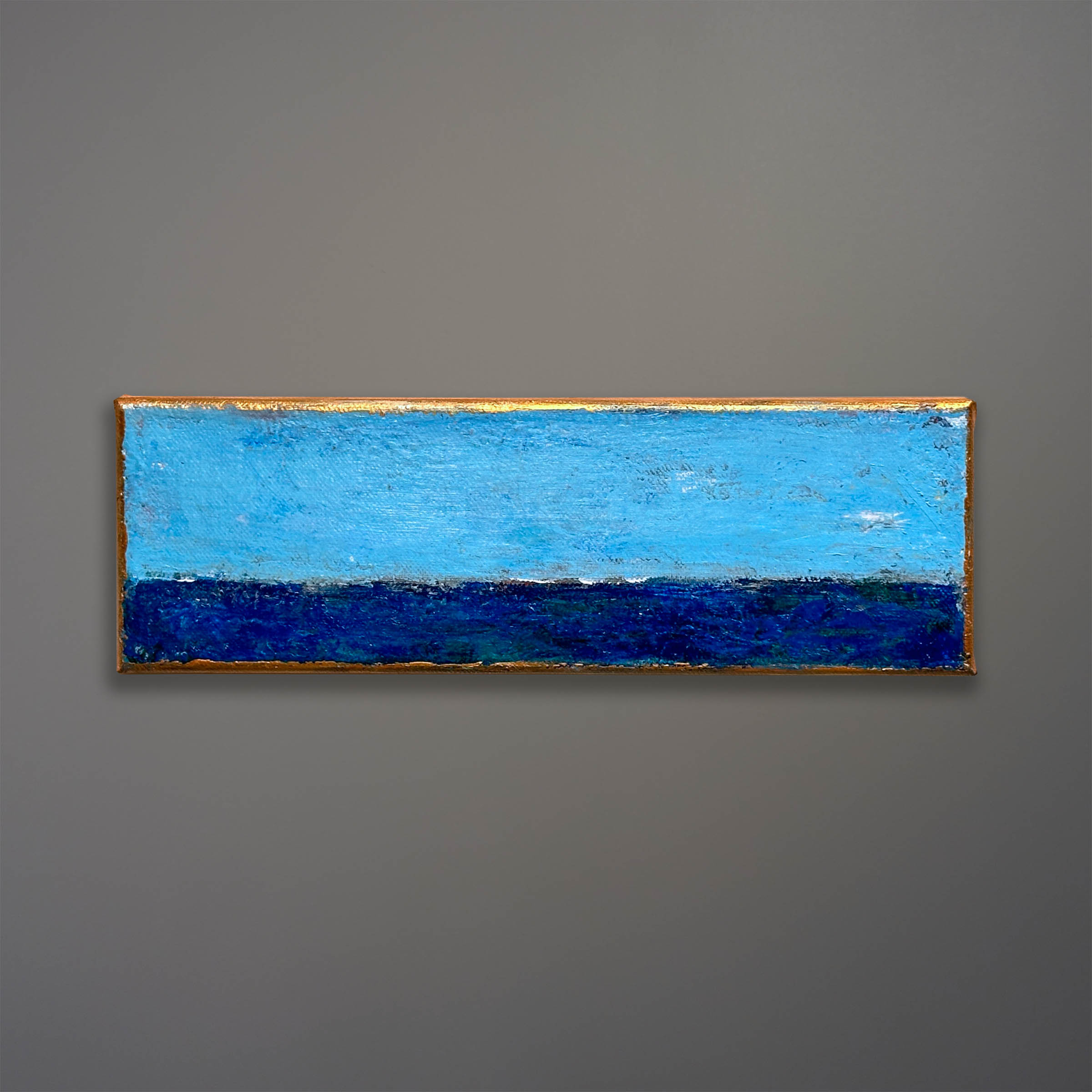Abstract painting by Charles Huschle, 2024. The diminutive size of this painting gives it a unique jewel-like quality. Confident brushwork and excellent color make it quite special. Edged in gold. 12 × 4 inches. Currently unframed. Huschle splits his time between here on the North Fork of Long Island and France.