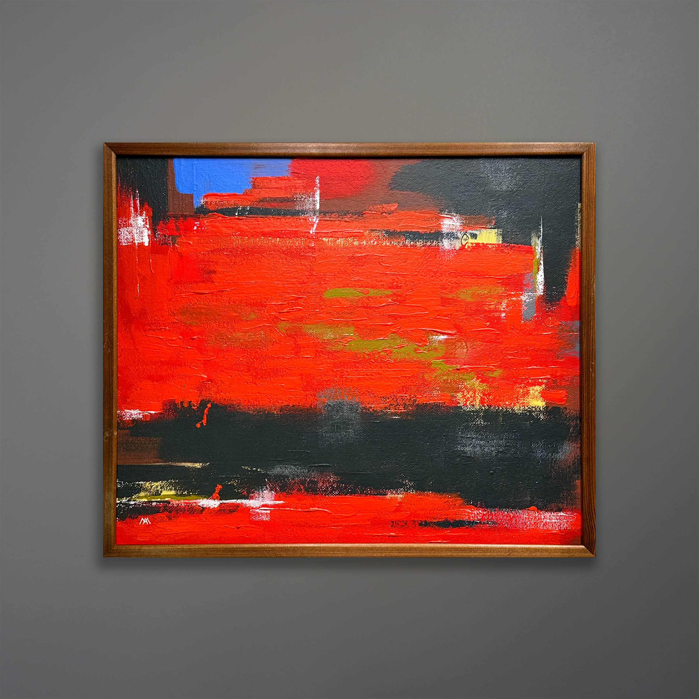 This painting by Michael Aron, titled “Duet I” is similar to a painting by my father Jon Aron. He was influenced by New York Abstract Expressionist artists that were exhibiting at the time when he was attending Pratt Institute in the mid-1950s. I made this painting as an homage to my father’s work, as well as the other AbEx leaders like Franz Kline, Mark Rothko, Willem de Kooning, Adolph Gottlieb, Clyfford Still, and Robert Motherwell. 23 x 20 inches in a vintage walnut frame. The frame show signs of wear.