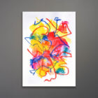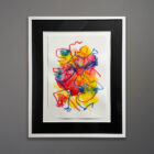 Energetic contemporary original watercolor and pastel painting on paper by Bruce J. Bloom. Circa early 2000s. It measures 23 × 29 inches as framed in matte white wood with a gallery acrylic face and a double-thick 8-ply black mat. It can be oriented vertically or horizontally.