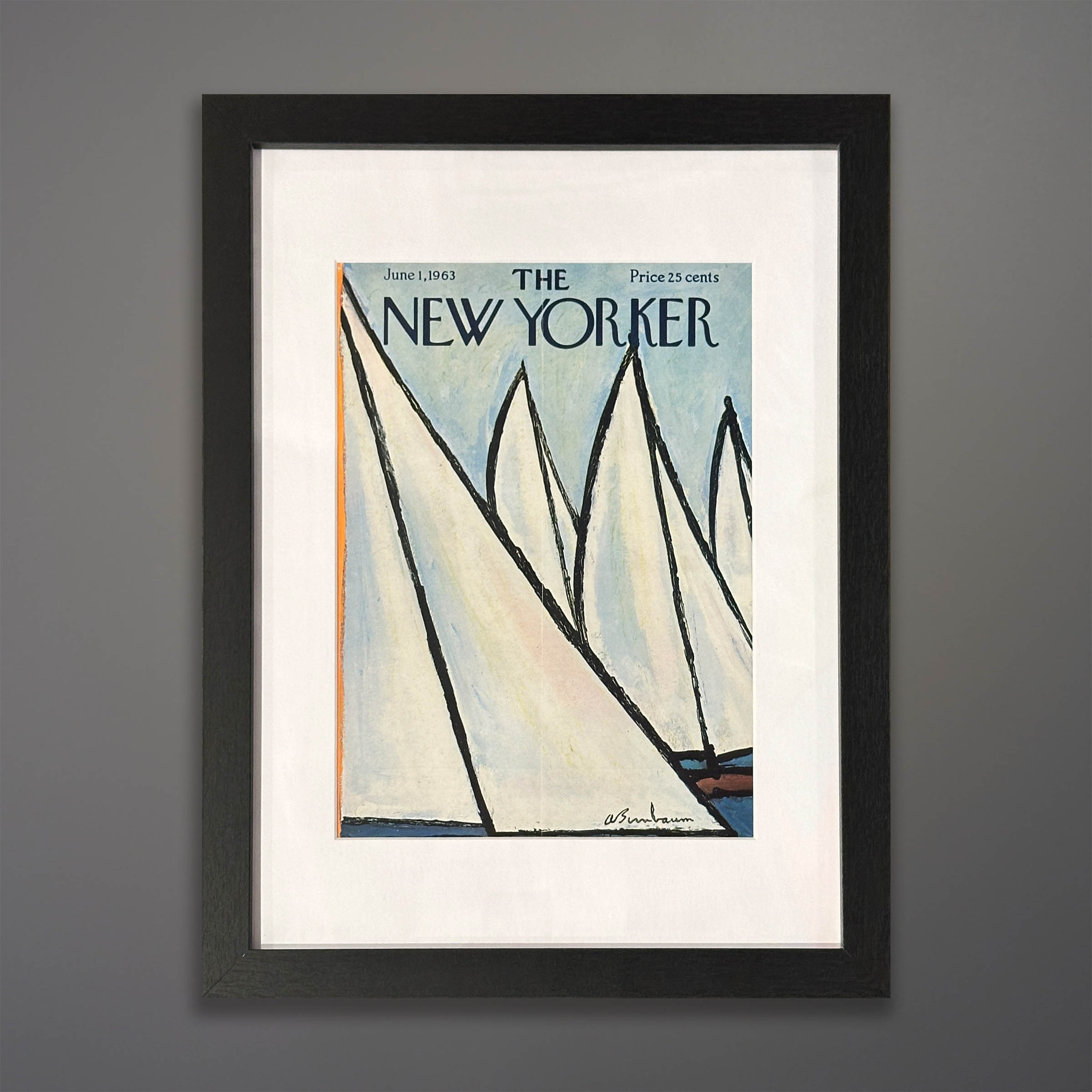Original cover from The New Yorker magazine from the June 1, 1963 issue. Framed in black wood with a 4-ply acid-free mat and gallery acrylic glazing. Overall size 14 x 18 inches. Artist: Abe Birnbaum (1899-1966). He created over 200 New Yorker covers(!).