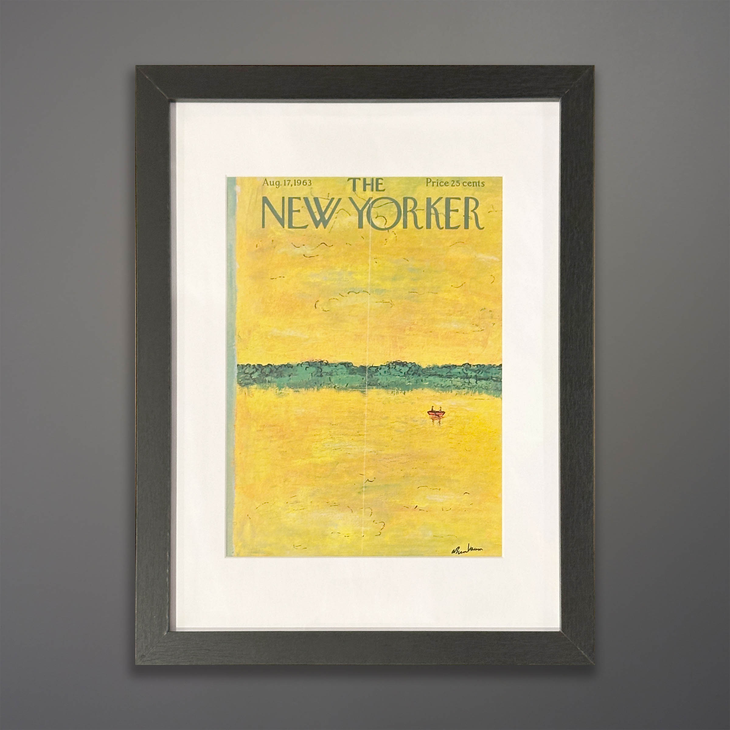 Original cover from The New Yorker magazine from the August 17, 1963 issue. Framed in black wood with a 4-ply acid-free mat and gallery acrylic glazing. Overall size 14 x 18 inches. Artist: Abe Birnbaum (1899-1966). He created over 200 New Yorker covers(!).
