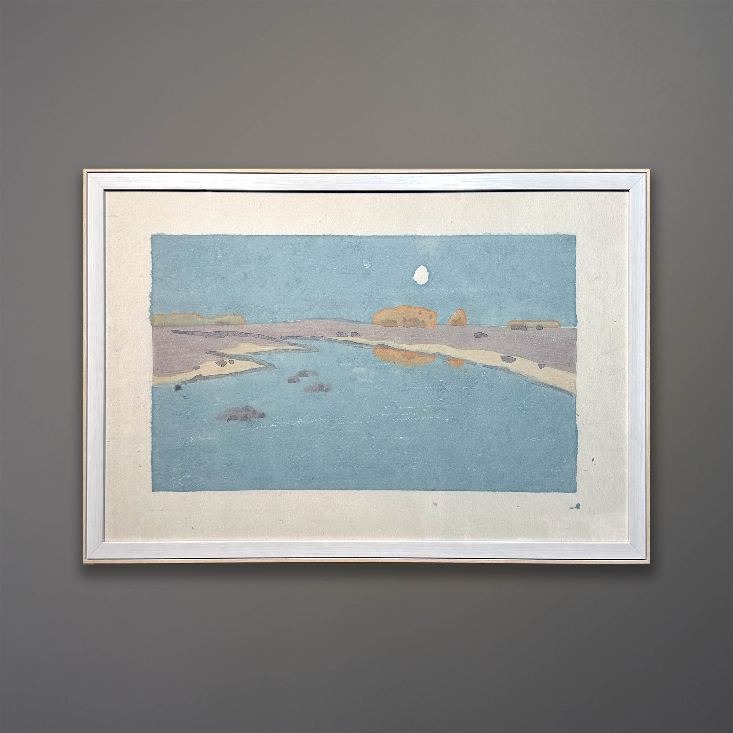 Arthur Wesley Dow, “Marsh Creek.” After the 1907 woodcut by this esteemed Massachusetts native. Offered here is an archival pigment print framed in white and oak tone MDF. 26 x 18 inches. The original is in the collection of the Metropolitan Museum of Art.