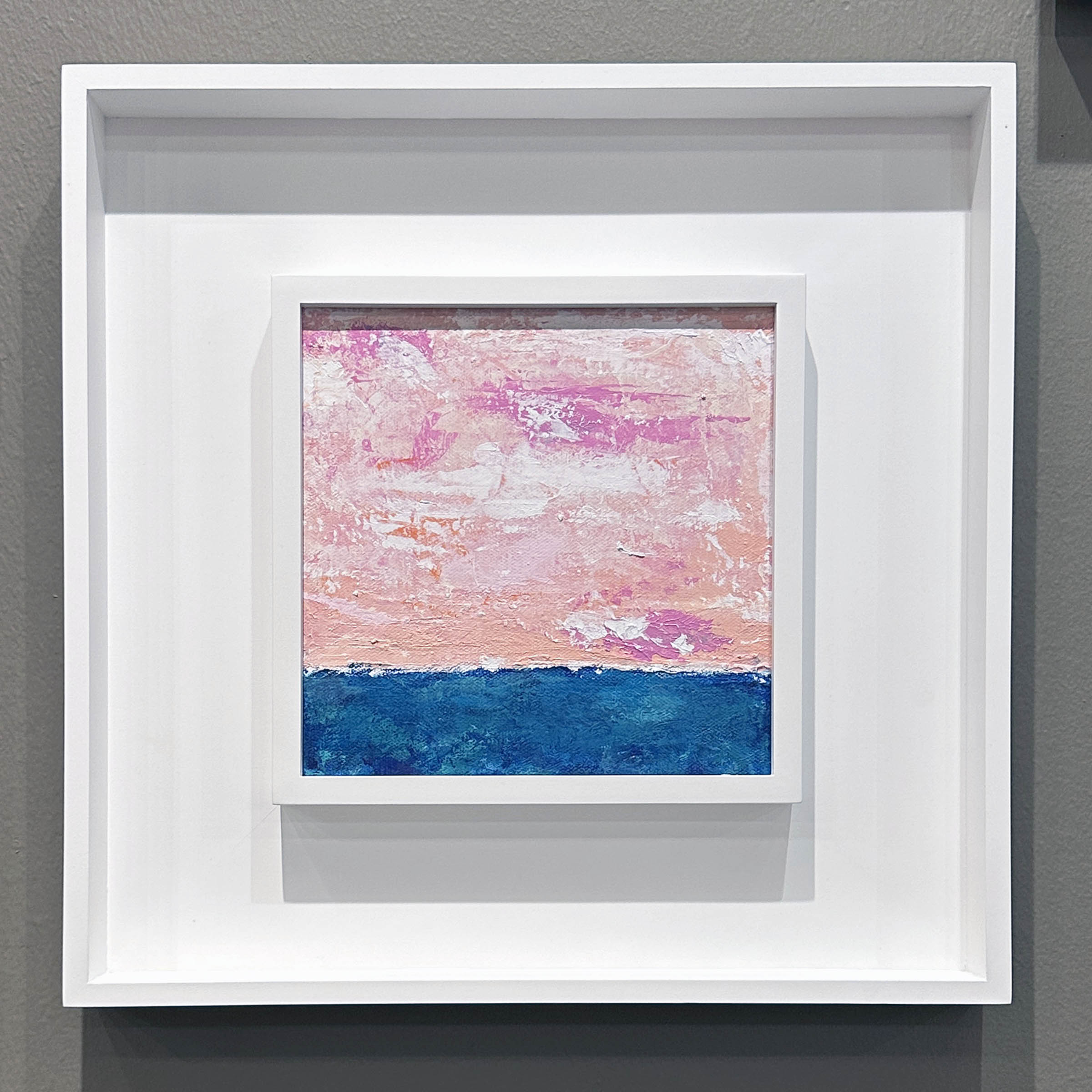 Impressionistic seascape by Charles Huschle. The painting is 8 x 8 in a 15 x 15 matte white shadow box. Huschle spent years here on the North Fork and is currently living in France. He has exhibited in New York, Colorado and Massachusetts.