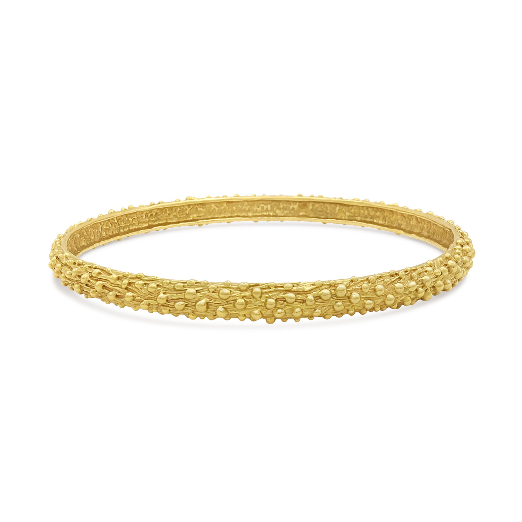 A superb artisan-made “Sea Dots” bangle featuring a mod texture that catches the light in a remarkable way. Solid 18k gold. 2.5 inches diameter, 7.85 inches circumference. Other sizes available with a 3-week lead time. Valerie English works from her studios in New York and here in Greenport on the North Fork.