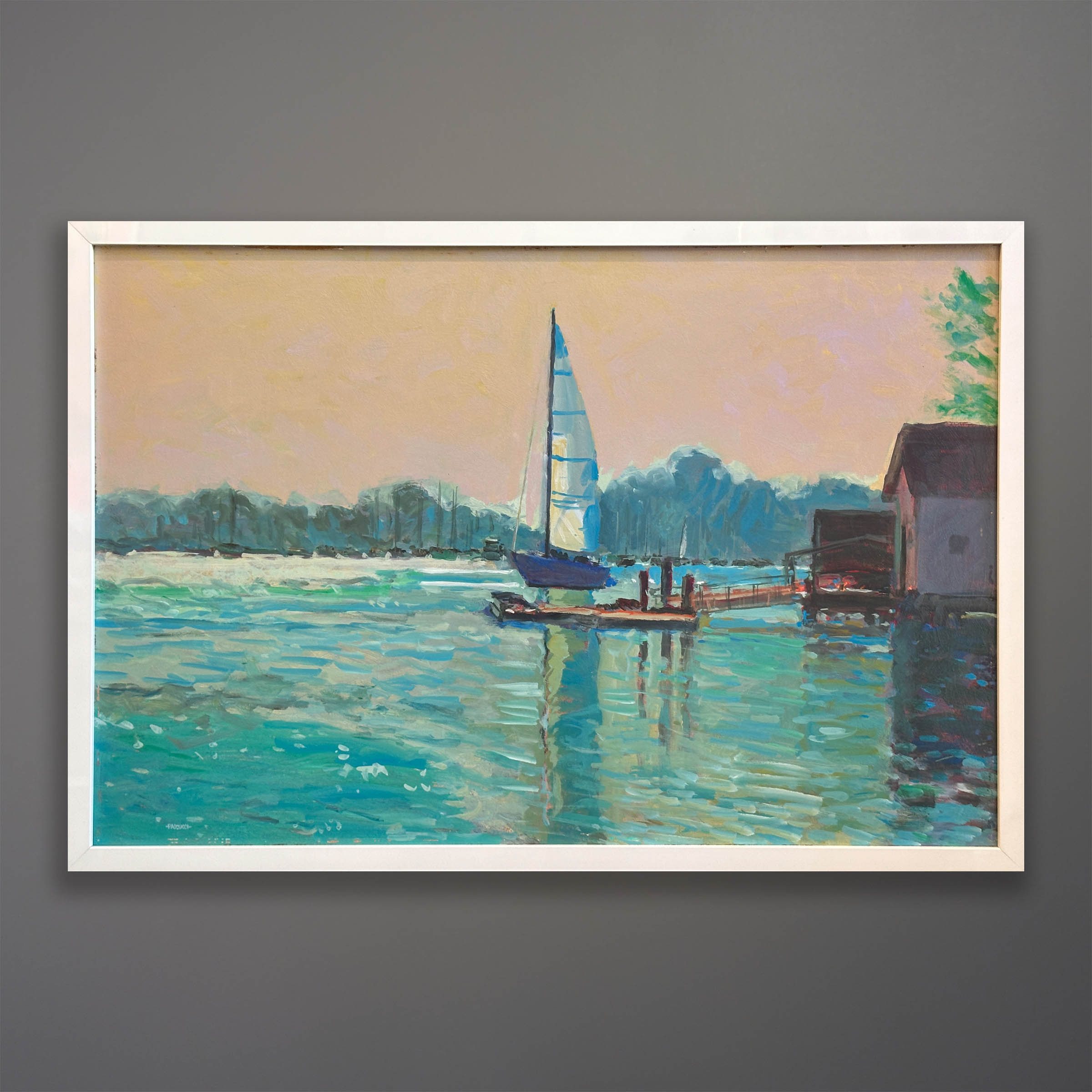 American School oil on board painting by James R. Pascucci (1928-2015) “Sunset Docking” 39 x 27 inches as framed in gloss white wood. Signed lower left, undated. Pascucci was a Weston, CT resident and an Art Director at Perkin-Elmer. He exhibited paintings in Greenwich CT, New Canaan CT, Nantucket MA, and West Palm Beach FL.