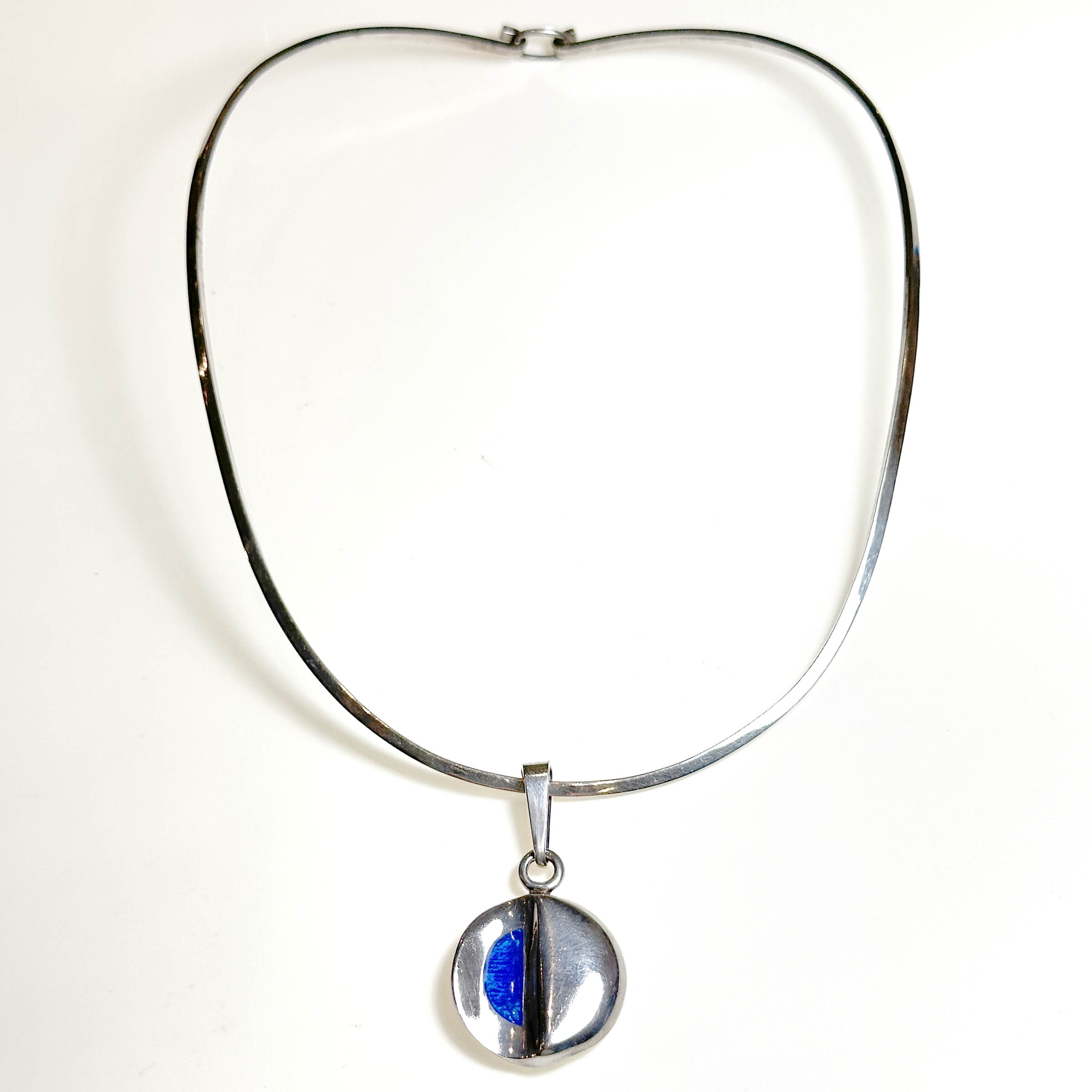 Pendant – Large vintage Mid-Century Modern Italian sterling and turquoise enamel, ca. 1970s–1980s. Unsigned. 21.4 grams. Shown on a marvelous Mid-Century Modern solid Sterling 925 collar necklace. 20.5 grams. Made in Mexico.