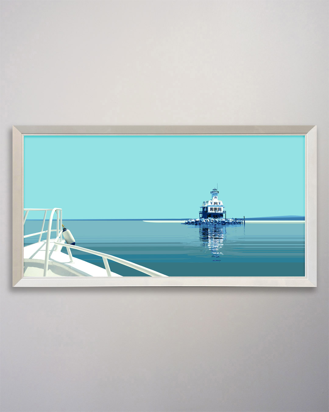 This print is based on the original painting by Michael Aron titled “Bug Lighthouse.” Offered here is a giclée print — a gallery-quality pigment print on matte archival paper using fade-free 12-color archival inks for crisp contrasts and 100-year longevity. 44 x 24 as framed. It depicts Bug Lighthouse aka Long Beach Bar Lighthouse located between Orient Harbor and Gardiner’s Bay, NY.