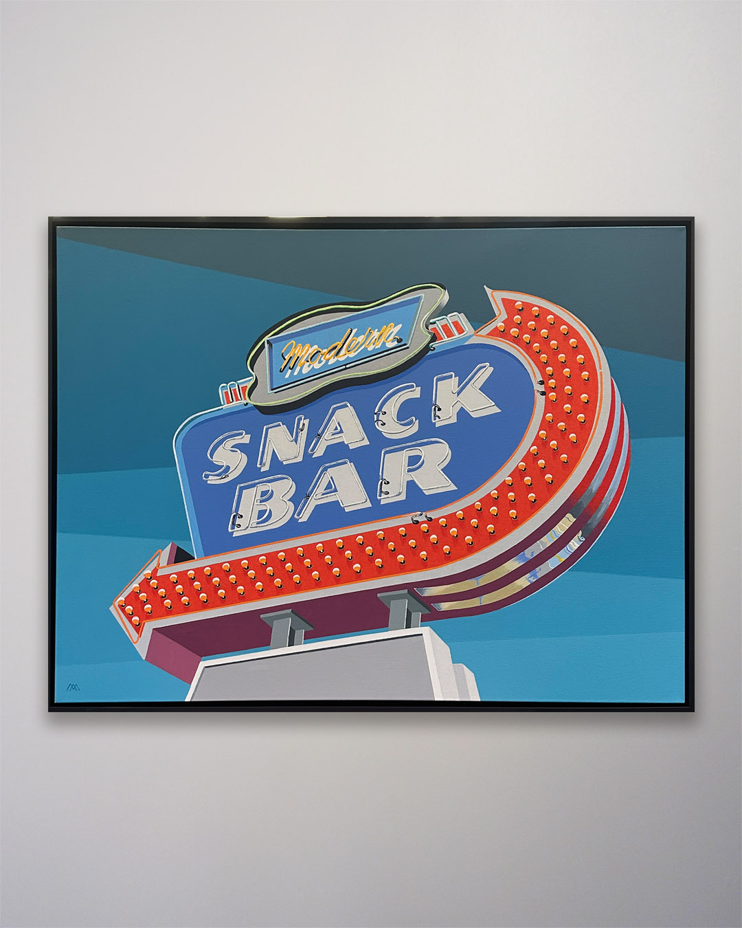 An original acrylic painting on heavy duty canvas titled “Modern Snack Bar” by Michael Aron, 2026. 42 x 32 inches float framed in matte black wood. A commission. The Modern Snack Bar is an iconic restaurant in Aquebogue, NY. Everyone driving east for the weekend passes by its distinctive 1950s neon sign.