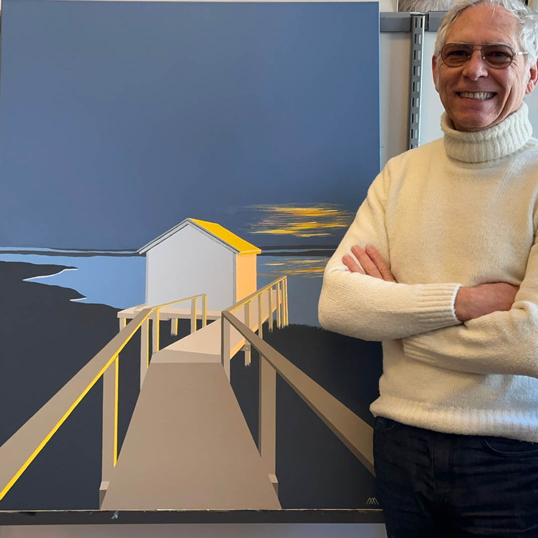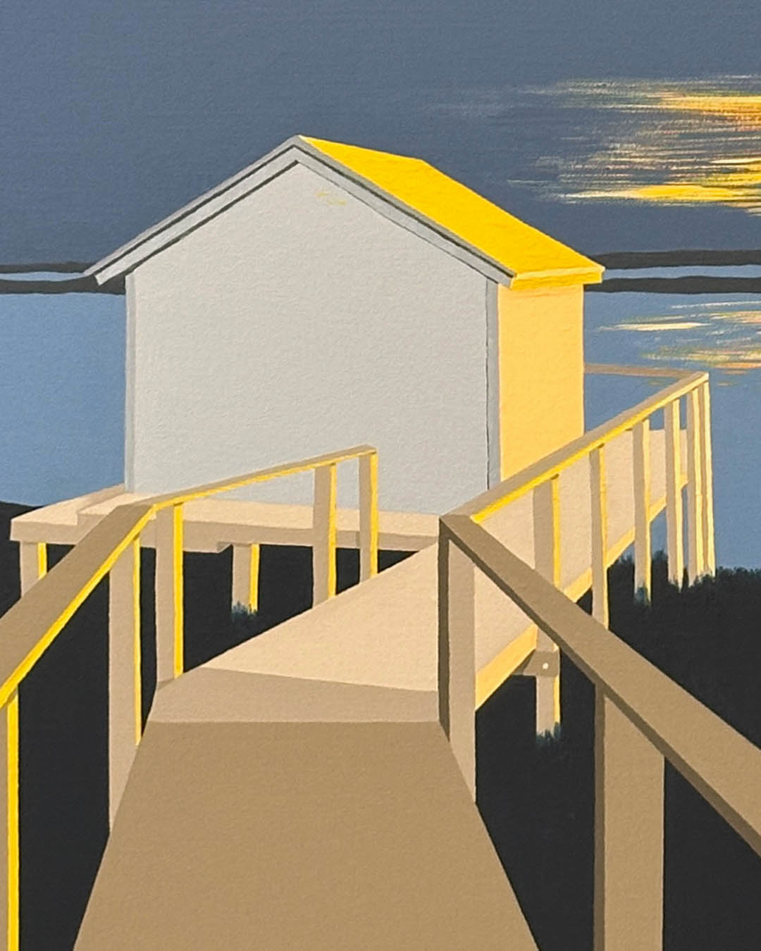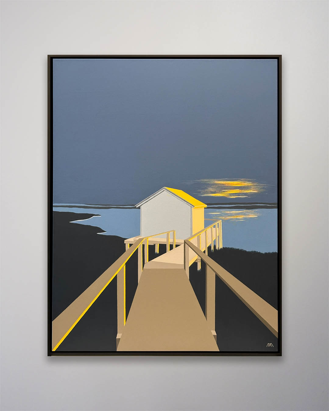 An original painting on heavy duty gallery-wrap canvas by Michael Aron “Orient Crab Shack Evening III,” 2026. It measures 32 x 42 inches as custom float framed in matte black wood. This painting was a commission—the colors were selected to coordinate with other artworks and decor.