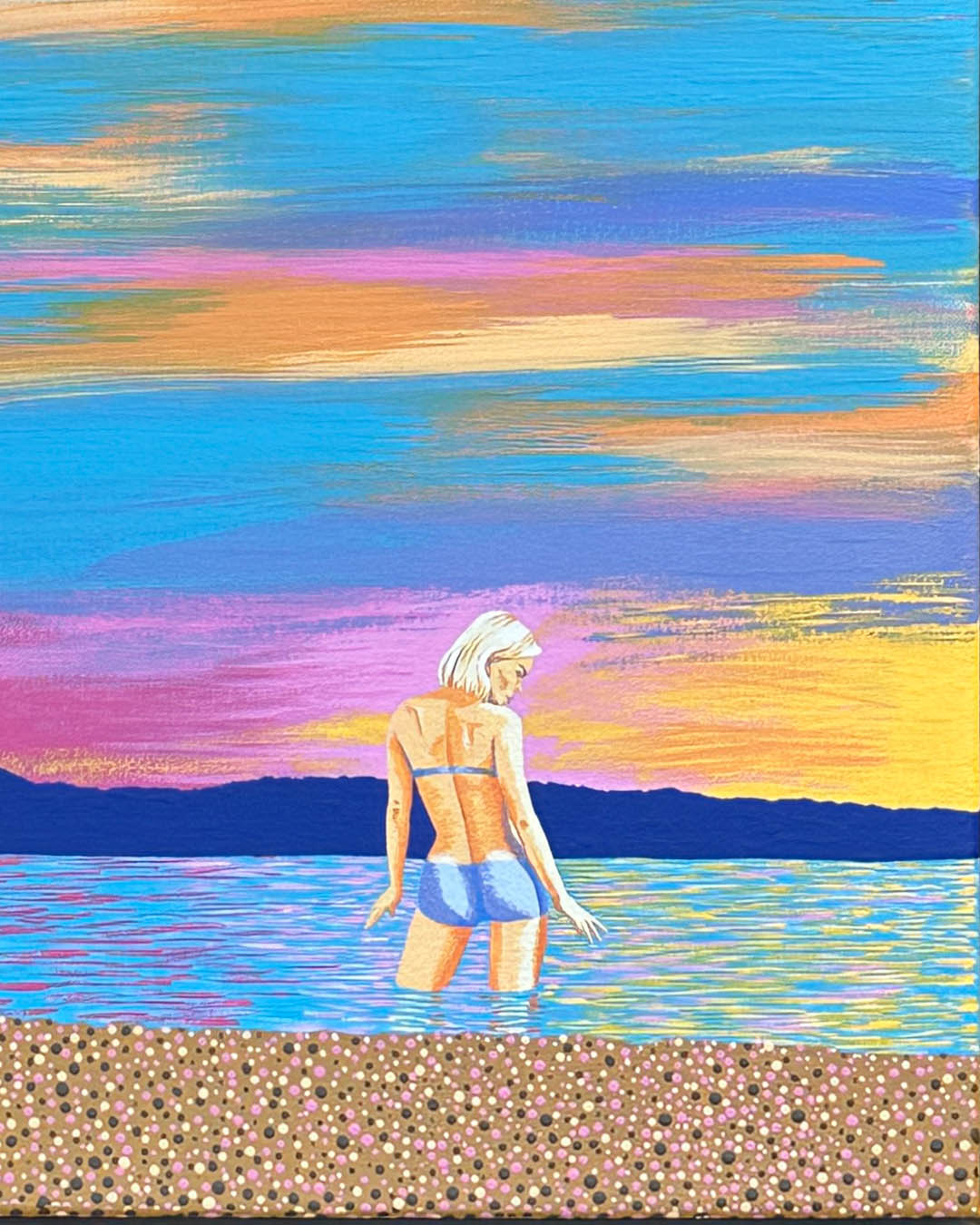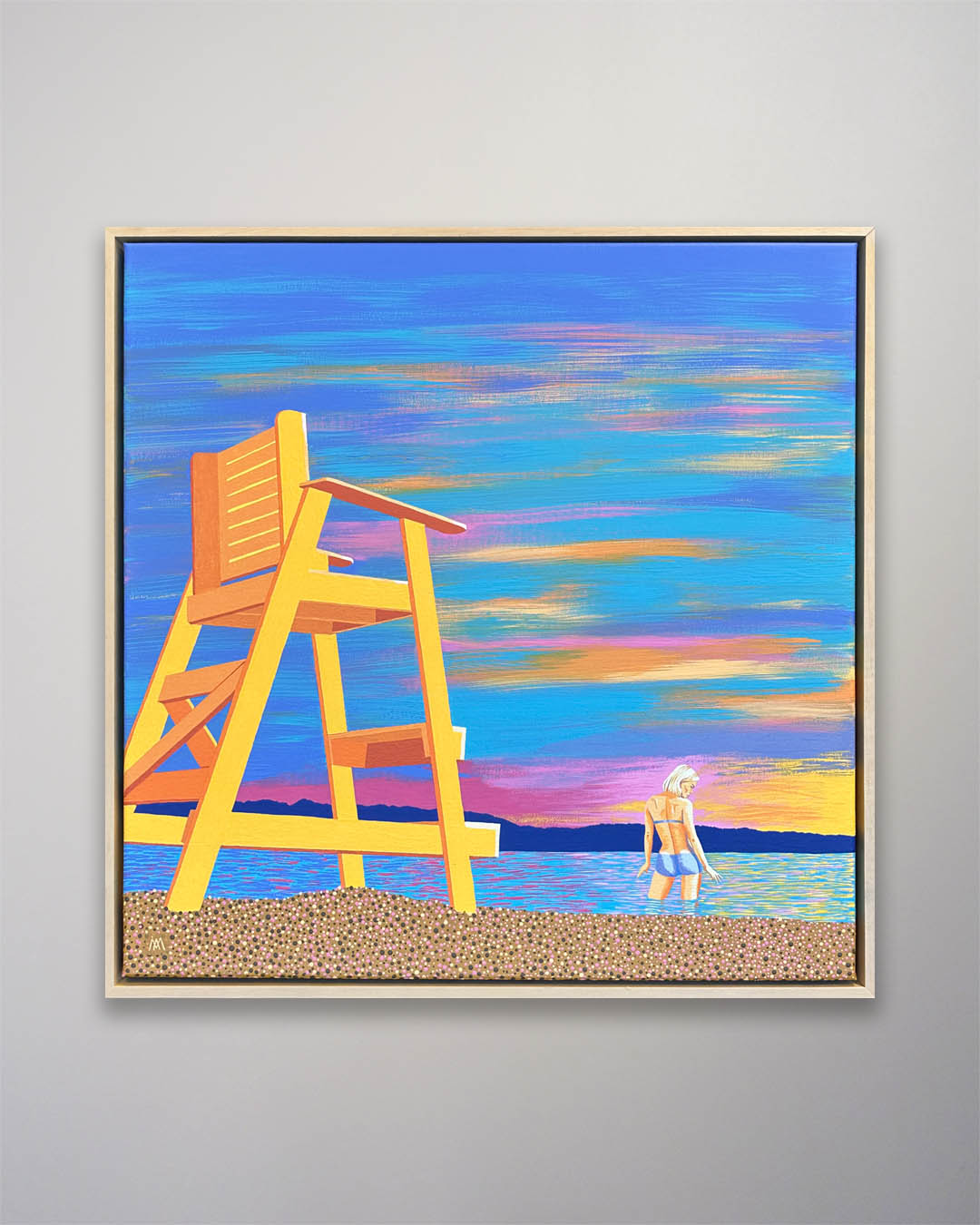 An original acrylic painting on linen titled “Fifth Street Beach II” by Michael Aron, 2026. 26 x 26 inches float framed in maple. Fifth Street Beach is a popular public Peconic Bay side beach facing Shelter Island, here on the North Fork of Long Island, NY.