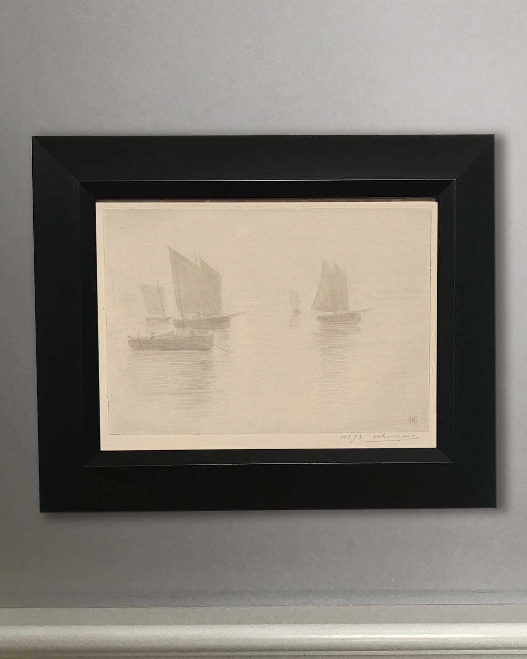 By Henri Charles Guérard, a French printmaker and painter. This work “Bateaux dans le Brouillard” was created in 1894. The title translates to “Boats in a Fog.” The original at the Metropolitan Museum of Art is a roulette lavis, painting the plate directly with acid, essentially drawing with acid rather than ink, and then washing it off when the desired effect had been achieved. Very very unusual. (Definition provided by printshop.org). Offered is reproduction from the original—an archival pigment print on 100% rag paper in a white wood frame with scratch-resistant acrylic. 9 × 11 inches framed.